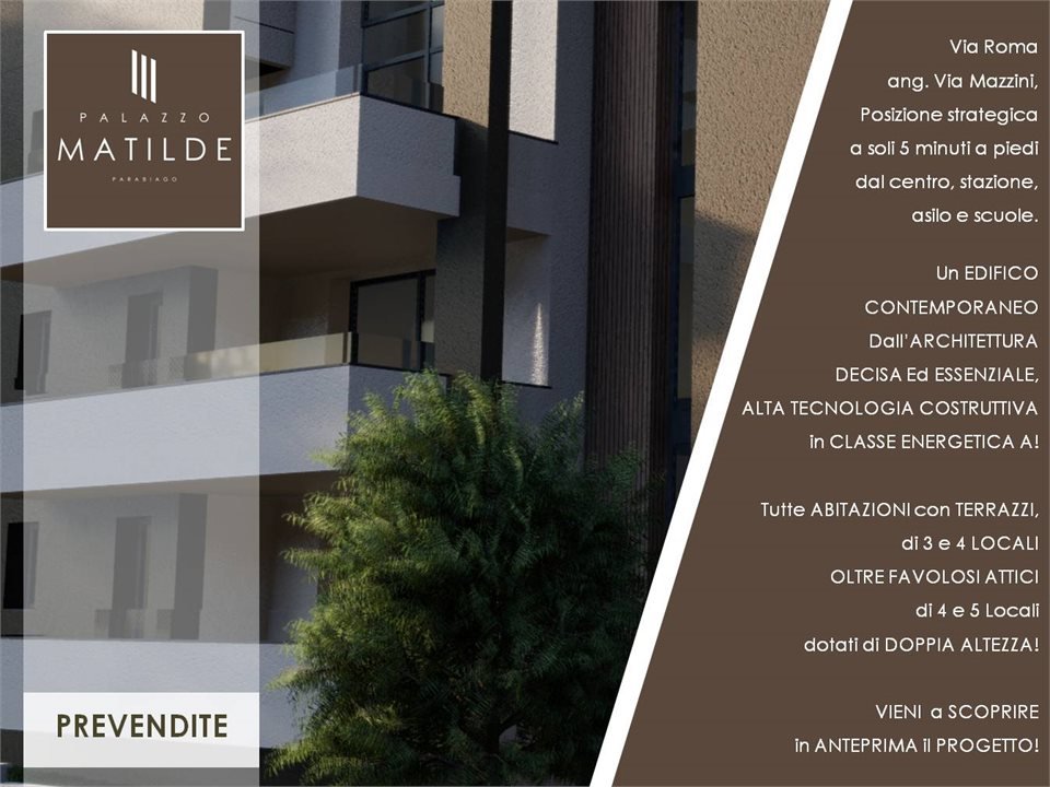 PALAZZO MATILDE è un edificio residenziale contemporaneo, dall'architettura decisa ed essenziale, progettato per distinguersi dai canoni estetici delle costruzioni degli ultimi anni, per le forme, per i colori delle facciate basato su gradazioni della terra in contrasto al bianco, per i colori dei serramenti scuro antracite, per i rivestimenti ricercati che in parte saranno presenti sulla facciata, e non da meno per i particolari ingressi sia pedonale che carraio progettati per enfatizzare l'accesso al palazzo.\nPALAZZO MATILDE verrà realizzato in via Roma ang. Via Mazzini, una posizione strategica a soli 10 minuti a piedi dal centro, dalla stazione e dalle scuole.\nPALAZZO MATILDE verrà costruito con materiali e tecnologie di ultima generazione, certificato in CALSSE ENERGETICA A4, oltre che ANTISISMICO, avrà una struttura in argisol, sistema costruttivo termo-acustico altamente performante, finestre e porte finestre in PVC sempre con elevato isolamento termo-acustico, tapparelle in alluminio coibentato, oltre impianti all'avanguardia come centrale termica elettrica con pompa di calore per la produzione di acqua calda e fredda, riscaldamento e raffrescamento radiante a pavimento, impianto di deumidificazione canalizzato di serie, impianto fotovoltaico, impianto elettrico con smart domotica di serie.