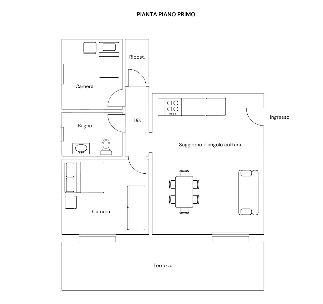 L'appartamento si sviluppa con ingresso sul soggiorno con cucina ad angolo cottura e ampio terrazzo perfetto per momenti all'aria aperta, disimpegno che porta a due camere da letto, un bagno finestrato e un comodo ripostiglio, che volendo si pu adibire a secondo bagno.