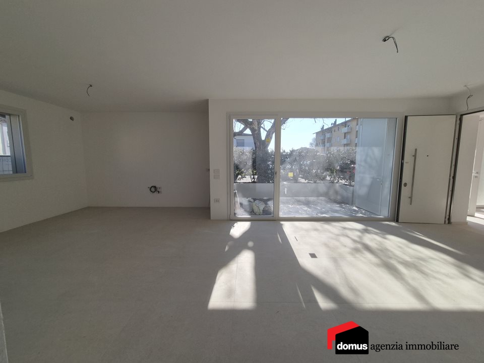 Villaverla: in posizione a ridosso del centro storico comodamente raggiungibile a piedi, nuovissimo appartamento BIICAMERE al piano terra inserito in un contesto di poche unità abitative e caratterizzato dalla presenza di un'ampia vetrata e finiture contemporanee.\nL'immobile si articola come segue: luminosa zona giorno con area cucina-pranzo e zona dedicata al salotto-Tv dotata di uscita diretta sull'area esterna vivibile e abitabile in ogni momento dell'anno; la zona notte ospita due camere da letto, 2 bagni completi entrambi finestrati e un piccolo angolo lavanderia.