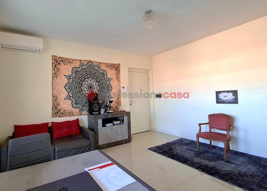 L'appartamento composto da un luminoso salone con angolo cottura, due camere da letto spaziose, due bagni di cui uno in camera finestrato e un bagno cieco, un balcone che offre una piacevole vista panoramica, un comodo posto auto coperto e una cantina per ulteriore spazio di archiviazione.