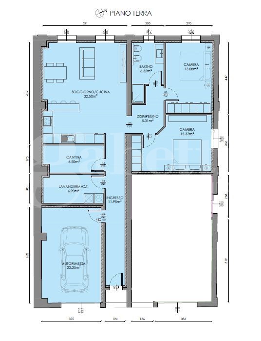 L'appartamento composto da sala/cucina, 2 camere, bagno, vano tecnico lavanderia e cantina/ripostiglio.