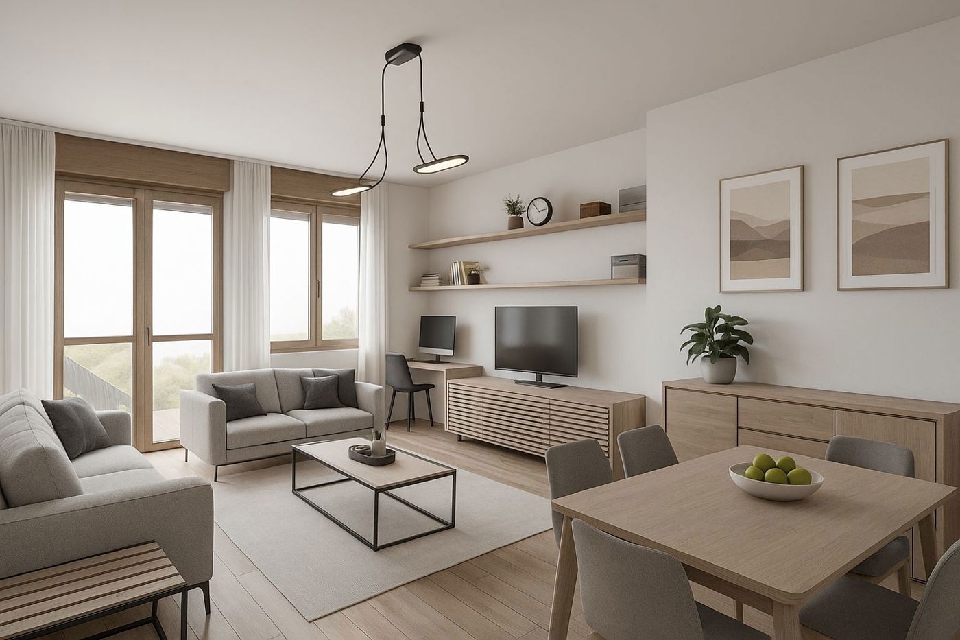Lingresso conduce a un grande disimpegno arredabile, che introduce alla zona giorno composta da un luminoso soggiorno con affaccio sul balcone, perfettamente organizzabile in zona pranzo, area TV/relax e angolo studio.