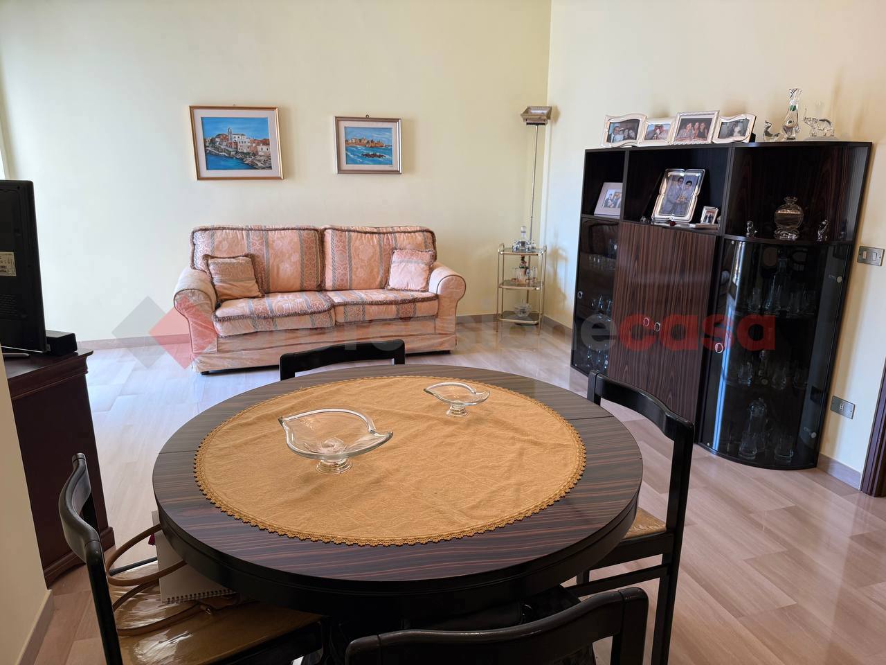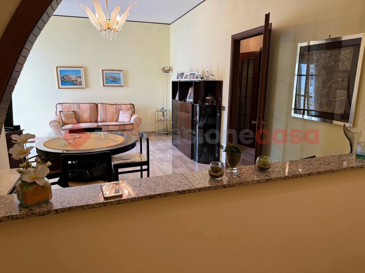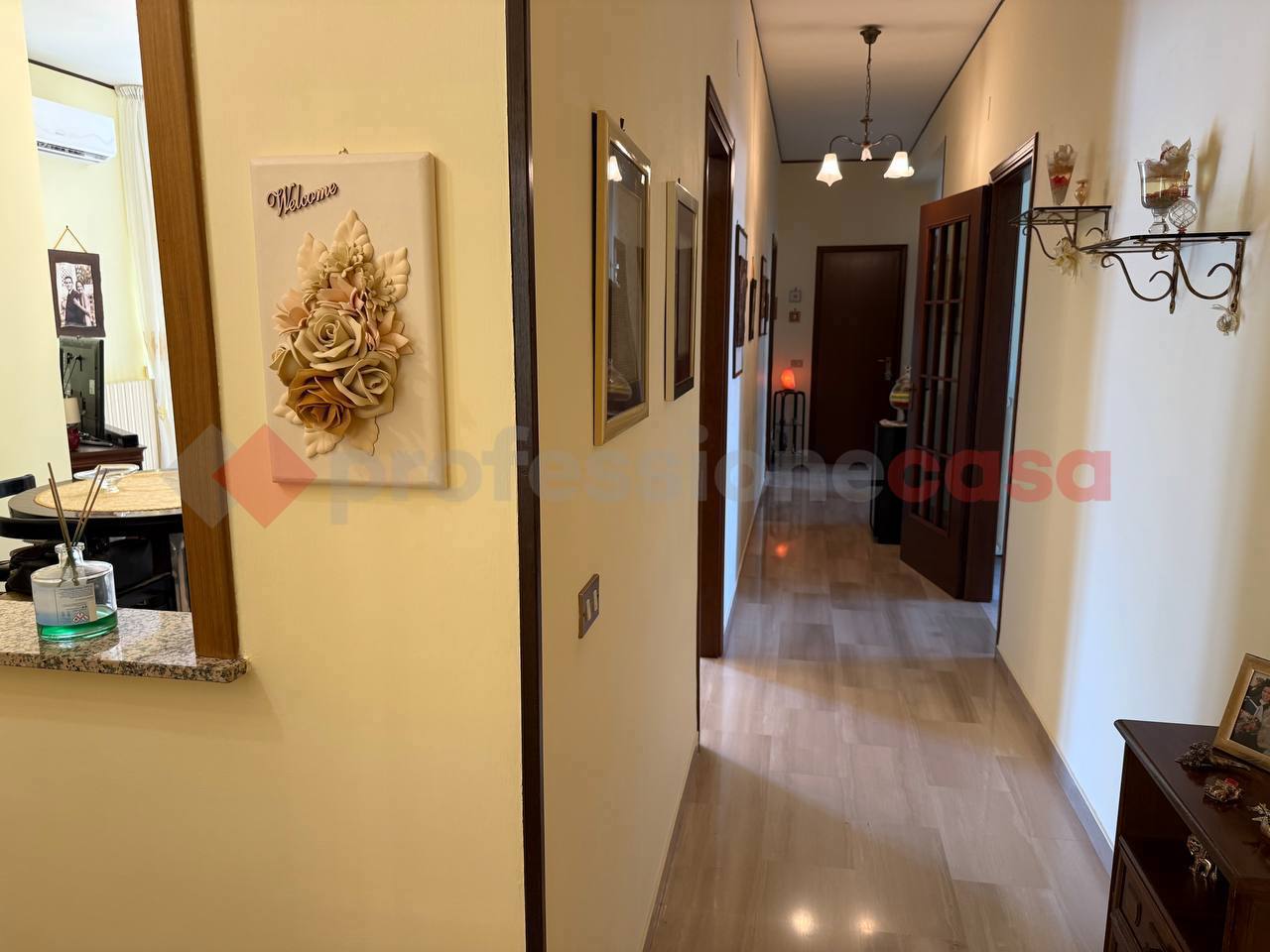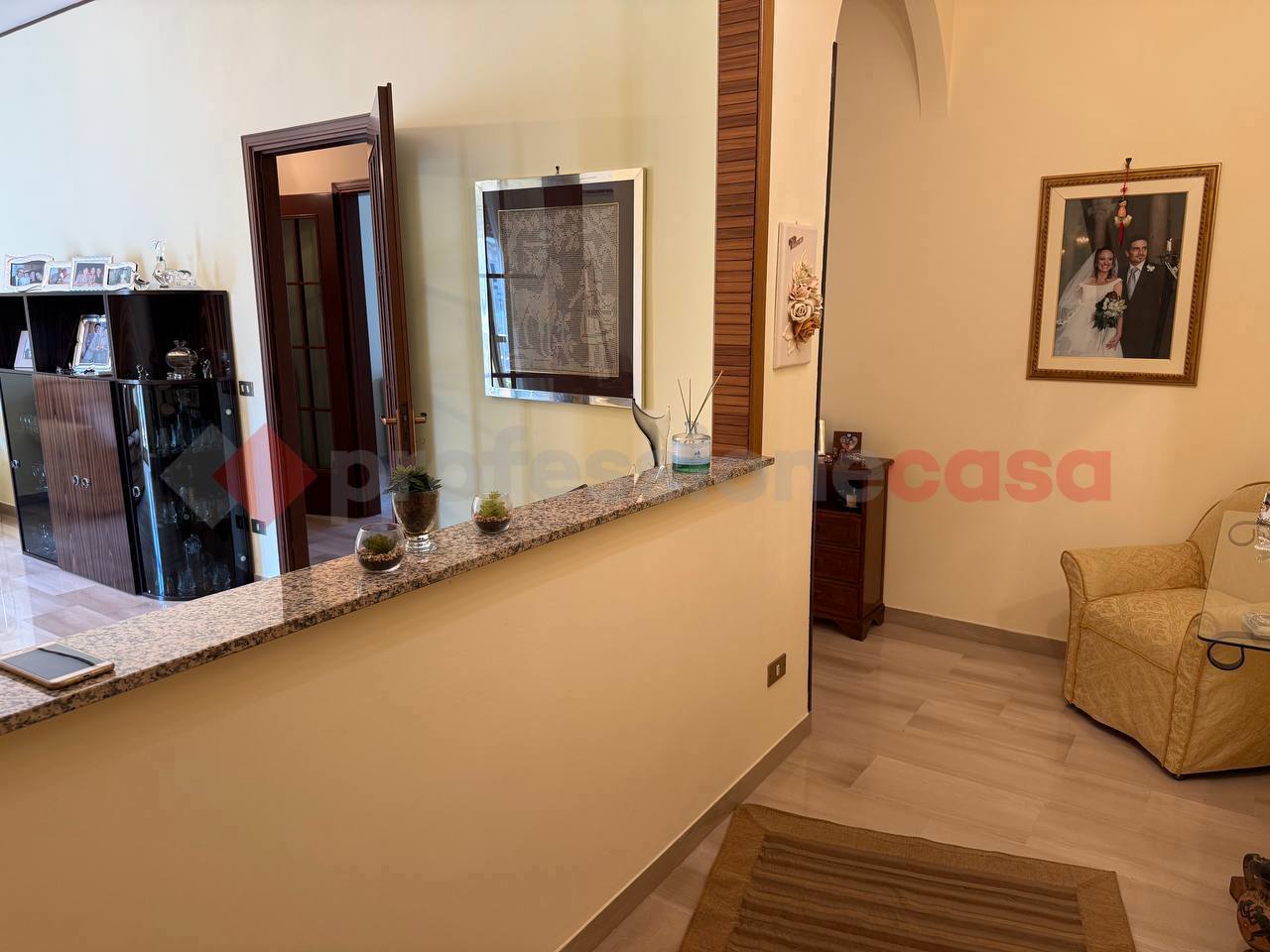 L'abitazione composta da un ampio ingresso in disimpegno, salone, cucina abitabile, due camere da letto, un bagno con box doccia e due ripostigli.