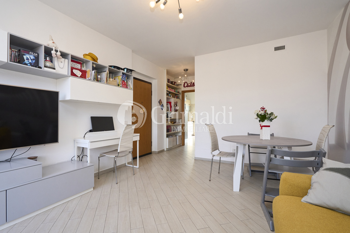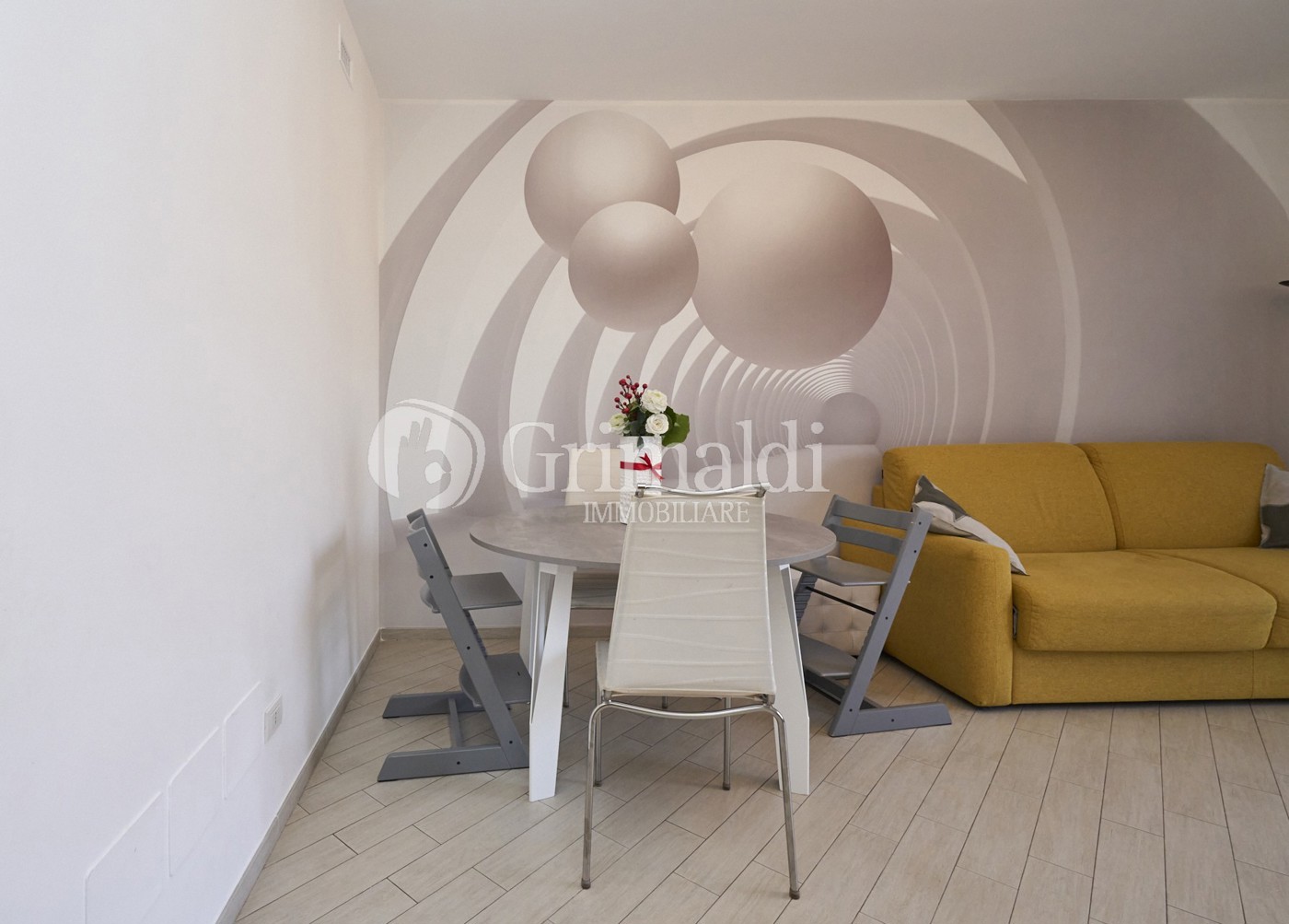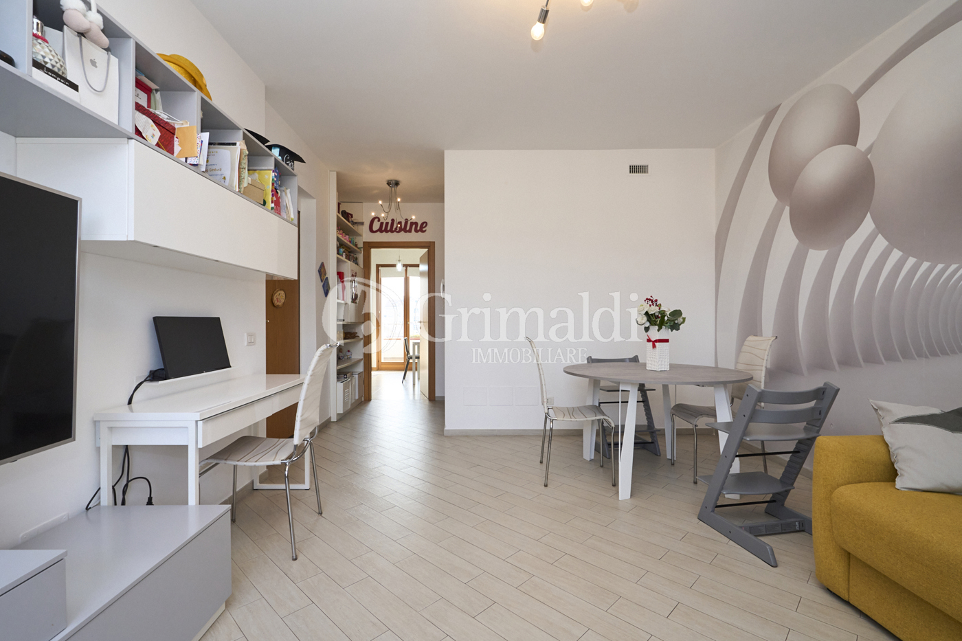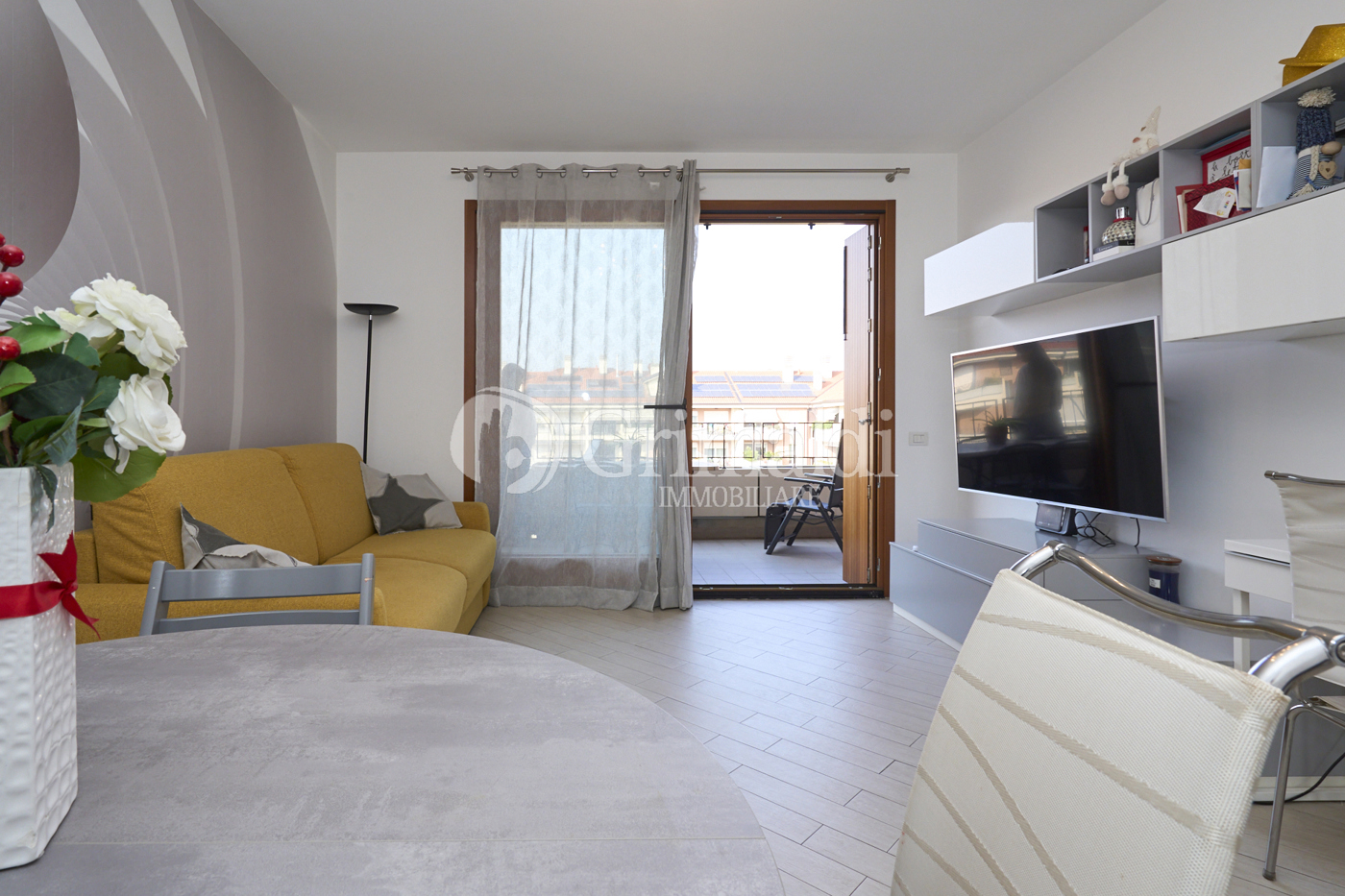 Il soggiorno gode di una luminosit naturale grazie all'accesso diretto a un terrazzo privato, perfetto per trascorrere momenti di relax o per accogliere ospiti in un'atmosfera piacevole e ariosa.