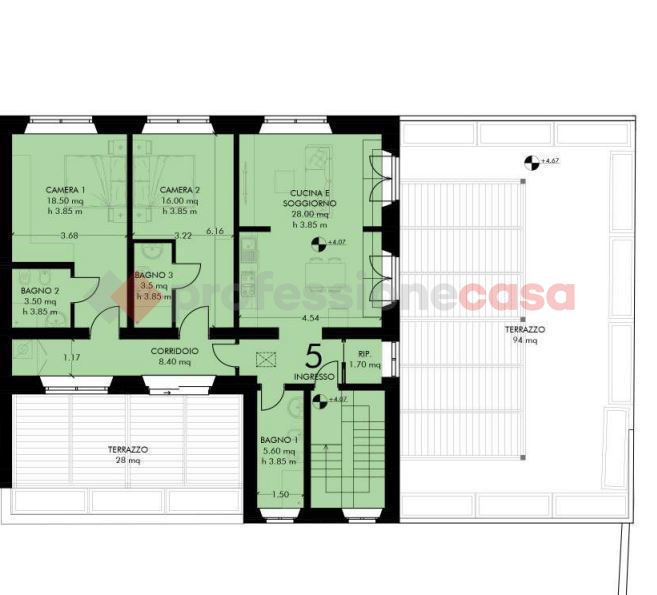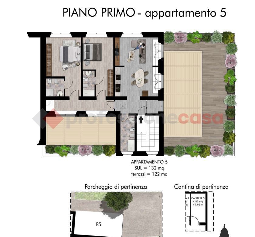 L'appartamento n.5 un trilocale di 132 mq circa , 2 terrazze per totali 122mq circa, cantina e posto auto. Posto al piano primo, l'immobile composto da ingresso, ampio soggiorno con cucina a vista ed accesso alla terrazza principale di 94mq ideale per la convivialit, disimpegno notte con accesso ad un ulteriore terrazzo di 28mq indicato per il relax, 2 camere matrimoniali con bagno privato, pi un bagno finestrato a servizio della zona giorno, ripostiglio.