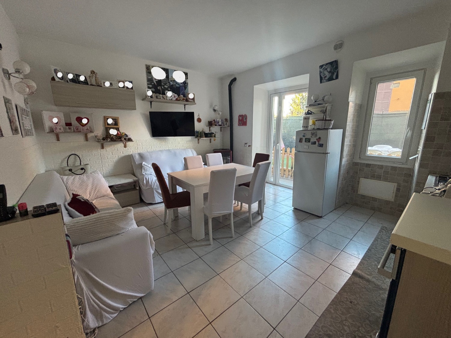 L'appartamento è composto da ampio ingresso, salone con angolo cottura e stufa a pellet collegata con i termosifoni, due ampie camere da letto matrimoniali, bagno finestrato con doccia e giardino di 100 mq. Completa la proprietà un garage attaccato all'abitazione e una cantina.