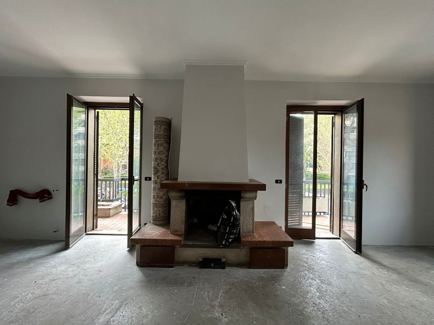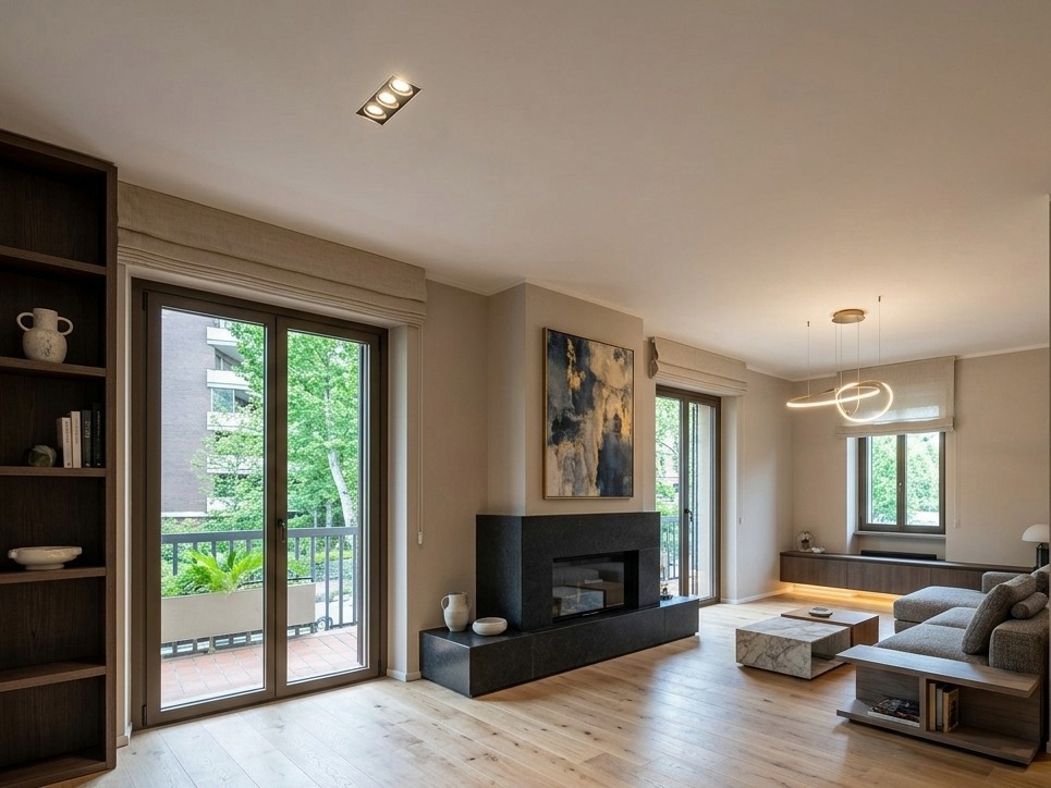 Lingresso si apre su un luminoso soggiorno doppio impreziosito da un grande camino.