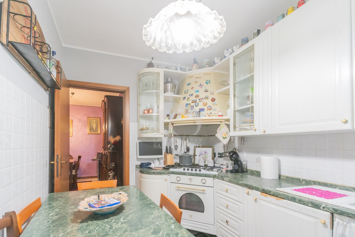 L'appartamento ha una superficie di circa 90 mq ed è distribuito in modo funzionale: soggiorno con accesso al balcone cucina abitabile separata due camere da letto due bagni due ampi balconi, uno a servizio della zona giorno e uno della camera da letto principale Dotazioni e dettagli L'altezza del piano garantisce vista aperta e ariosa; nelle giornate limpide lo sguardo si estende fino al profilo delle montagne, offrendo una percezione di spazio e luce difficilmente replicabile ai piani più bassi.