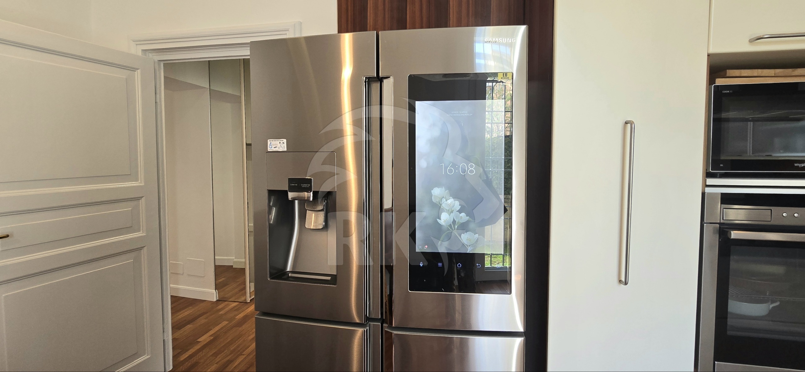 Cucina Abitabile: un ambiente completamente attrezzato con elettrodomestici top di gamma, tra cui spicca il frigo Samsung Smart 4 porte con display, forno a microonde, forno elettrico e lavastoviglie.