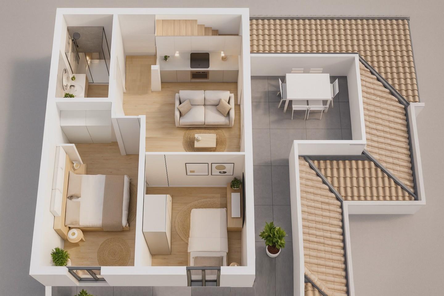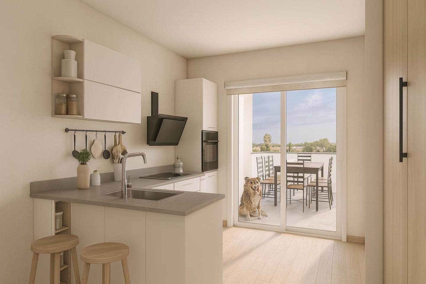 Il progetto prevede la realizzazione di una generosa zona giorno suddivisa in angolo cottura, sala pranzo e soggiorno TV. Attraverso l'apertura si fuoriesce sulla terrazza.