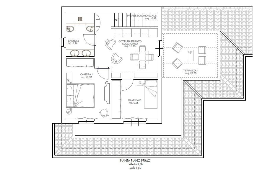 L'ingresso avviene per mezzo della scala esterna posta nel resede di proprietà dove può trovare parcheggio anche un'autovettura oltre che a biciclette/scooter.