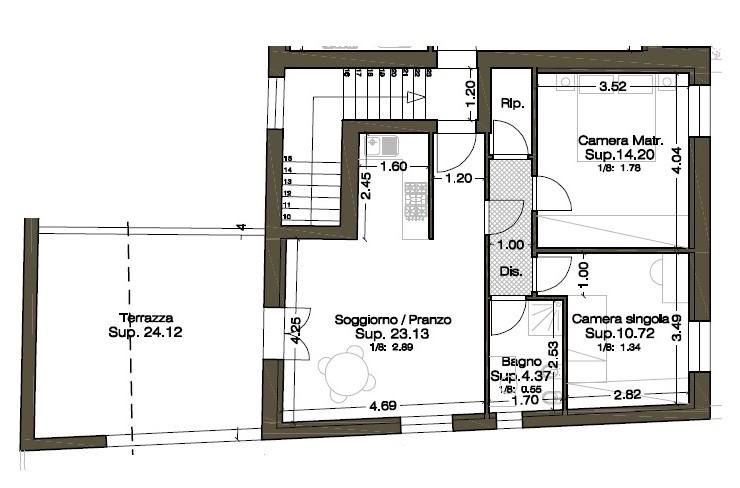 Labitazione, ha ingresso indipendente tramite scala interna di 2. Allinterno si compone di: Ingresoo in soggiorno con zona cottura con accessi alla terrazza di 25 mq; Disimpegno notte, Camera matrimoniale, Camera media, Ripostiglio; Bagno moderno e finestrato.