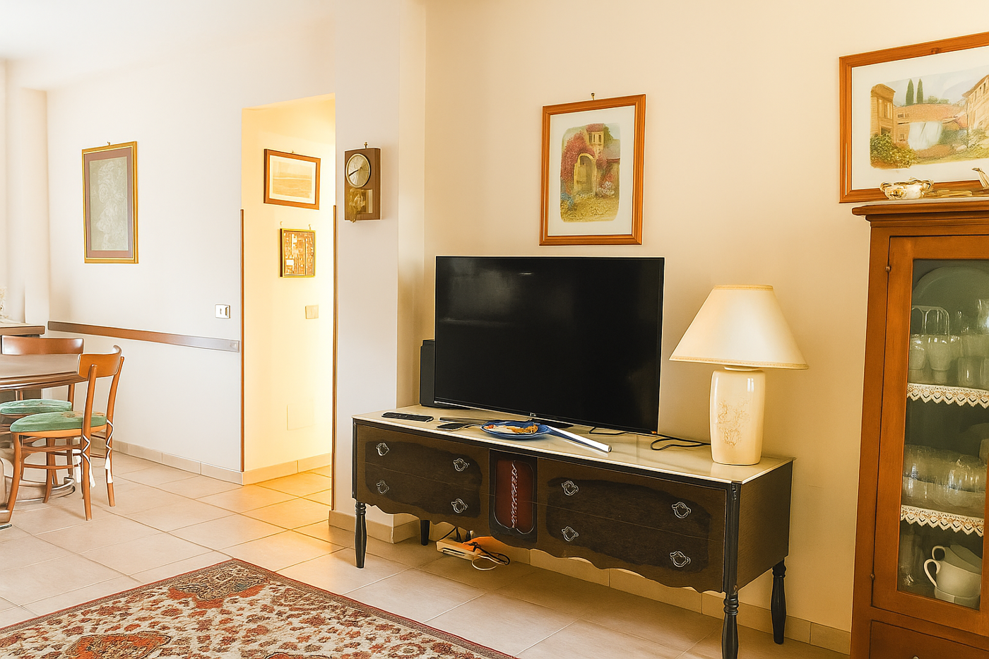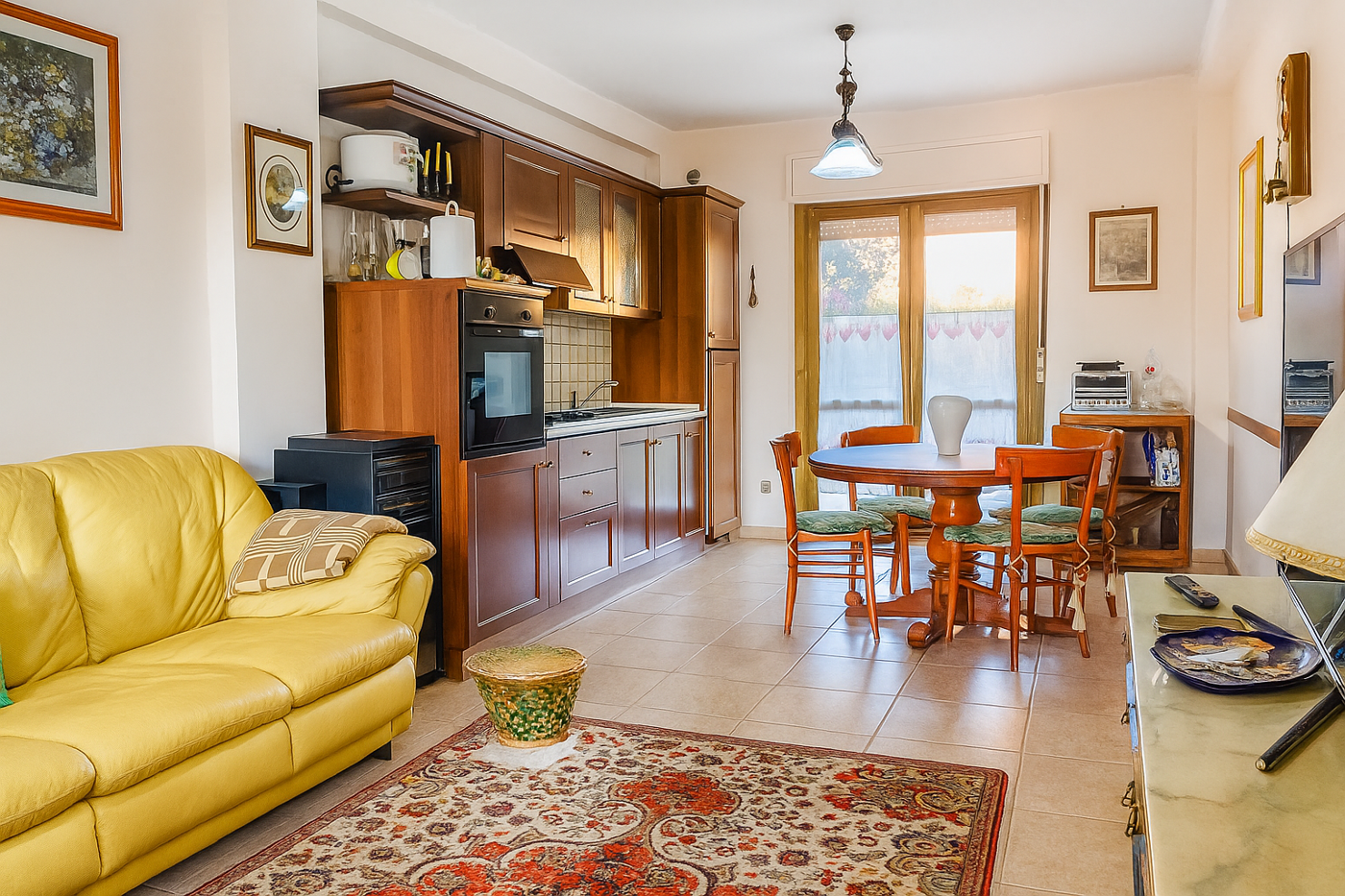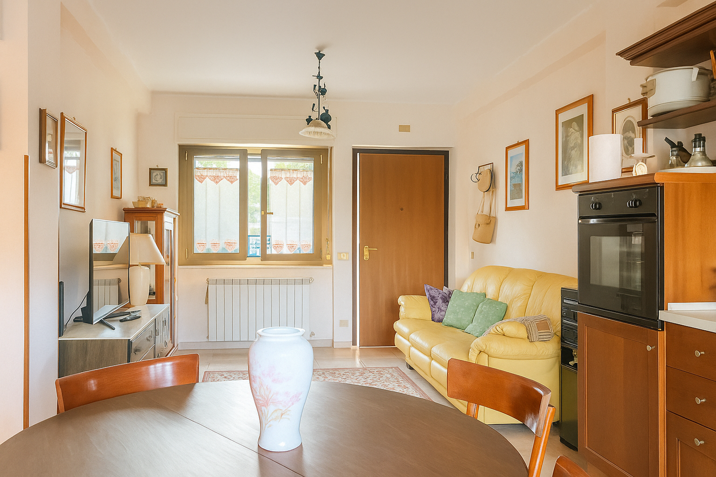 La zona giorno si compone di un soggiorno con angolo cottura, caratterizzato da una doppia esposizione con uscite su lati opposti, ovvero sul giardino dingresso e su un ampio balcone riservato.