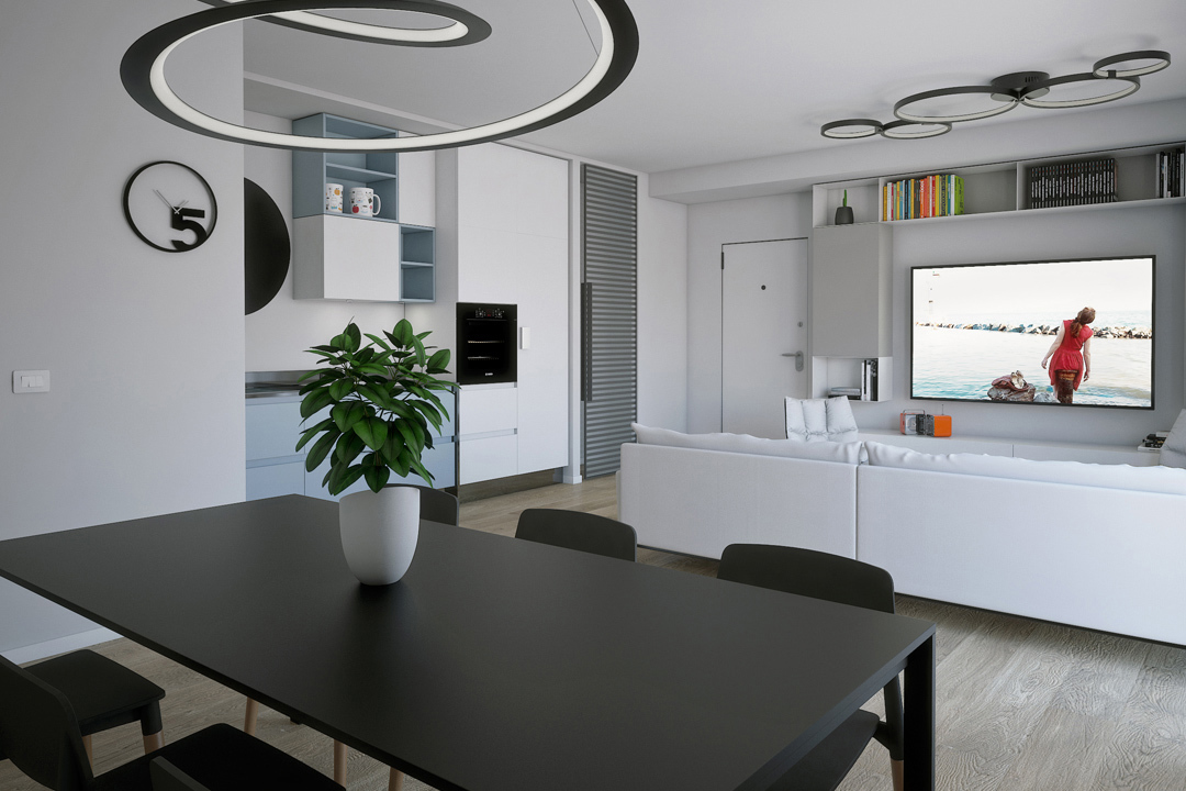 L'alloggio formato da un soggiorno con cucina a vista, due camere da letto grandi, due bagni e un ampio giardino privato di 120mq.
