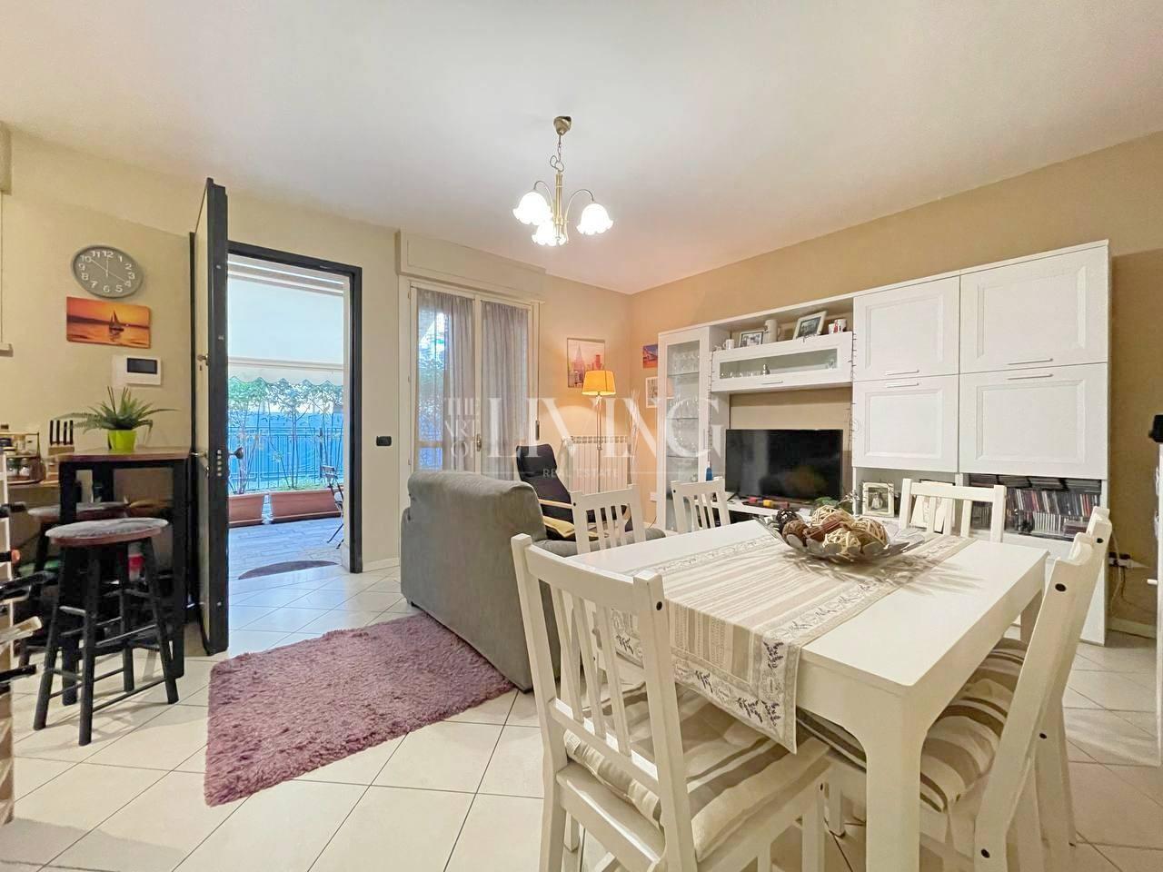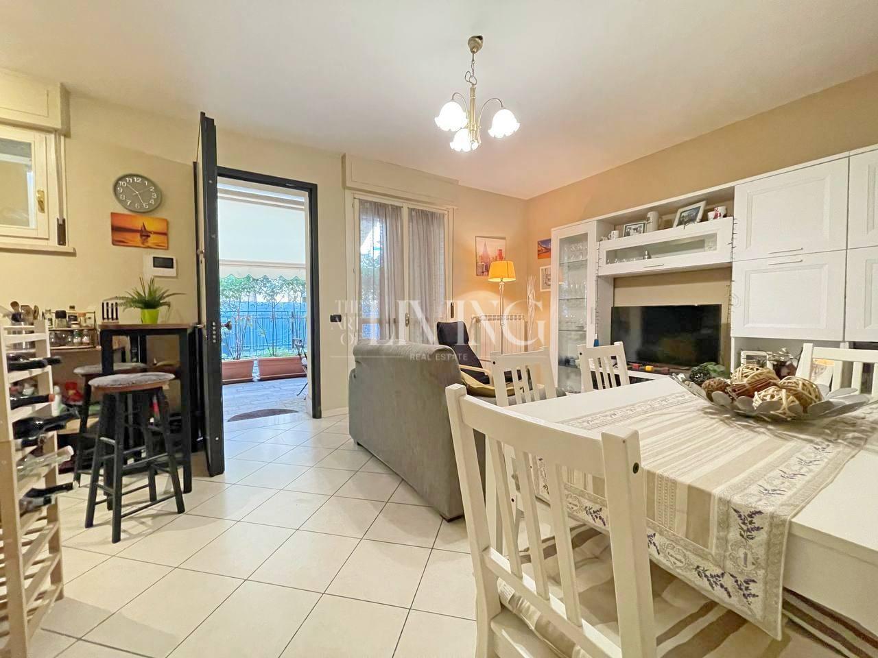 Lingresso si apre su un soggiorno con angolo cottura, dal quale si accede tramite porta-finestra a una resede privata, ideale per pranzi e cene allaperto.