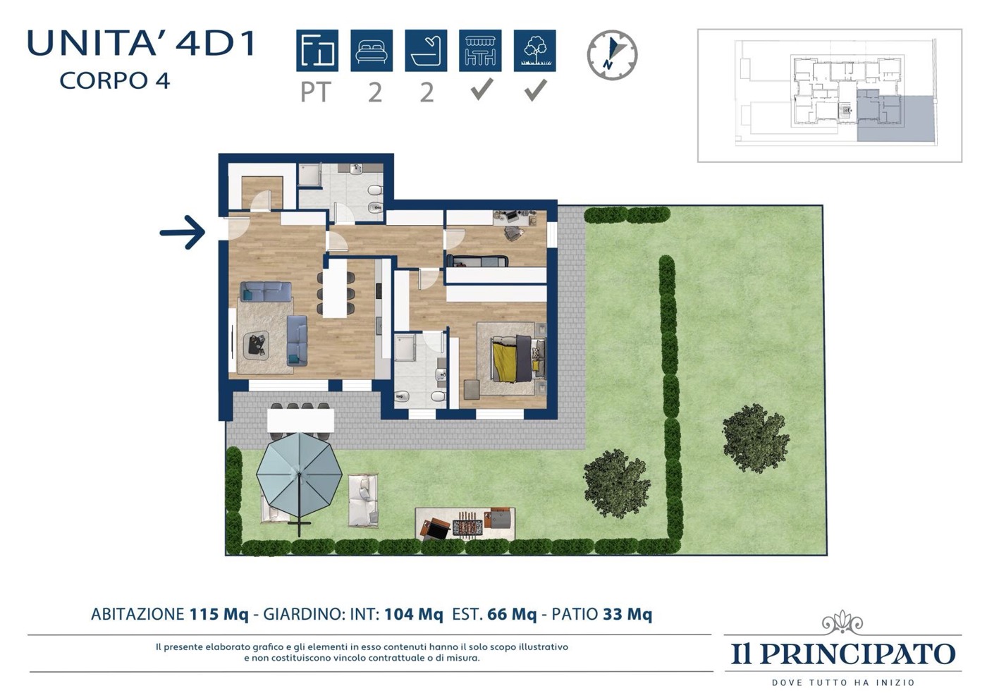 A completare la propriet il patio esterno, di circa 33 mq, che ci accompagna allo splendido giardino privato di 104mq.