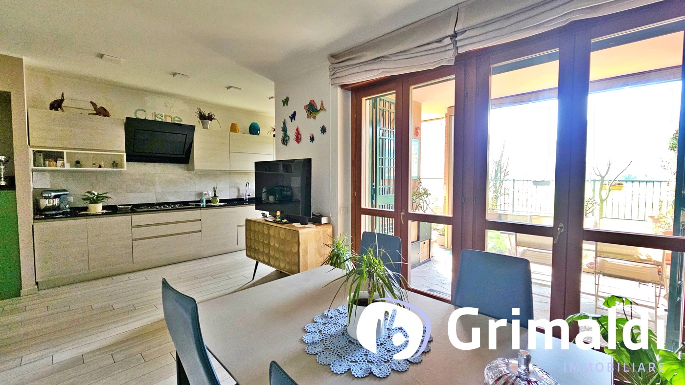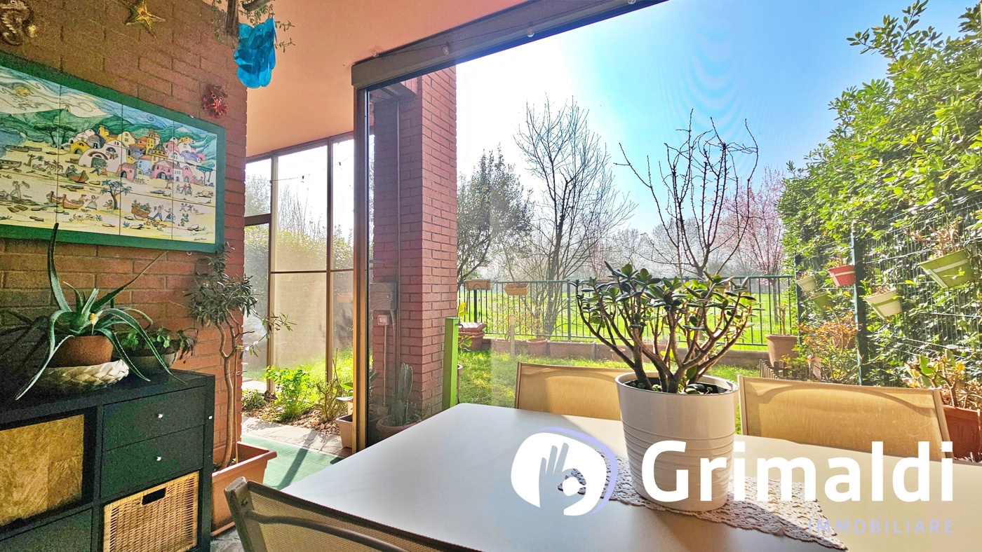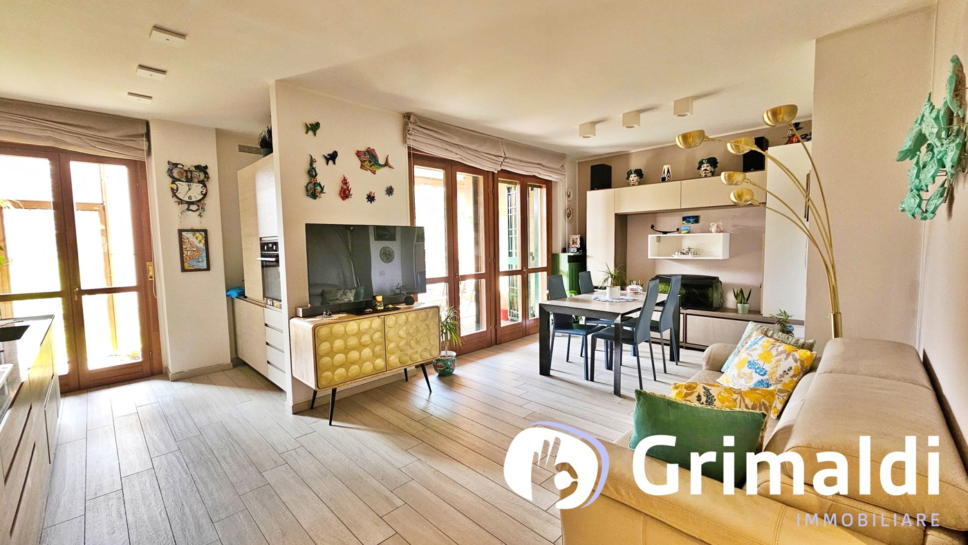 Lingresso si apre su una spaziosa zona living con cucina a vista, un ambiente conviviale e luminoso che affaccia direttamente sul giardino privato, ideale per momenti di relax allaperto o per ricevere amici e familiari.
