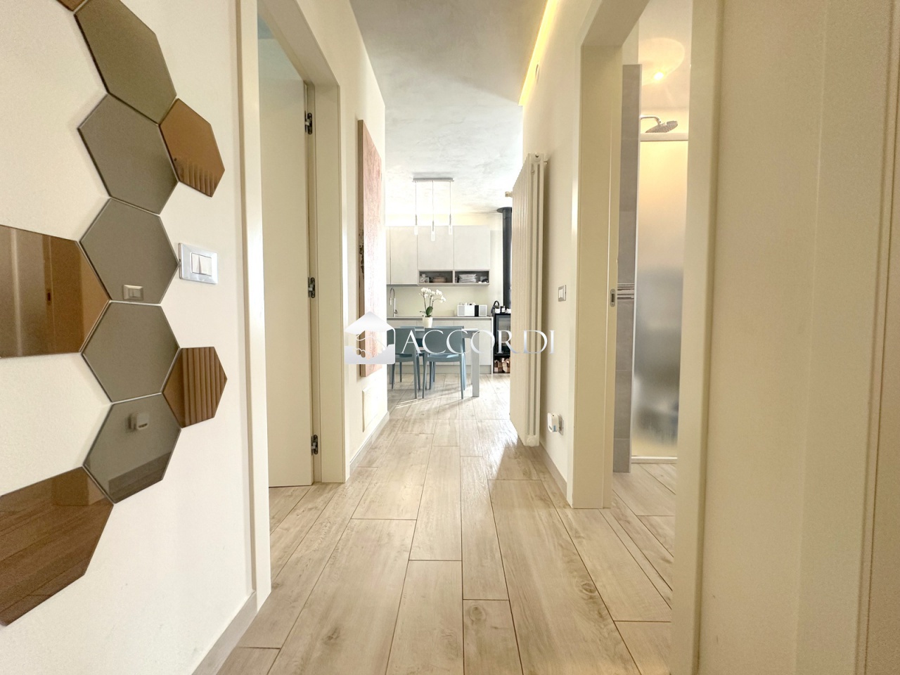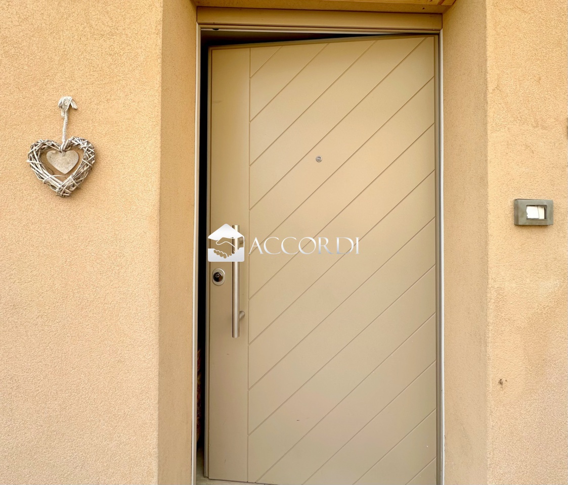 Ingresso nel corridoio dell'abitazione, zona giorno open - space , bagnio , due camere di cui una matrimoniale da ben 20 mq Al piano terra ambio giardino dotato di pompeiana.