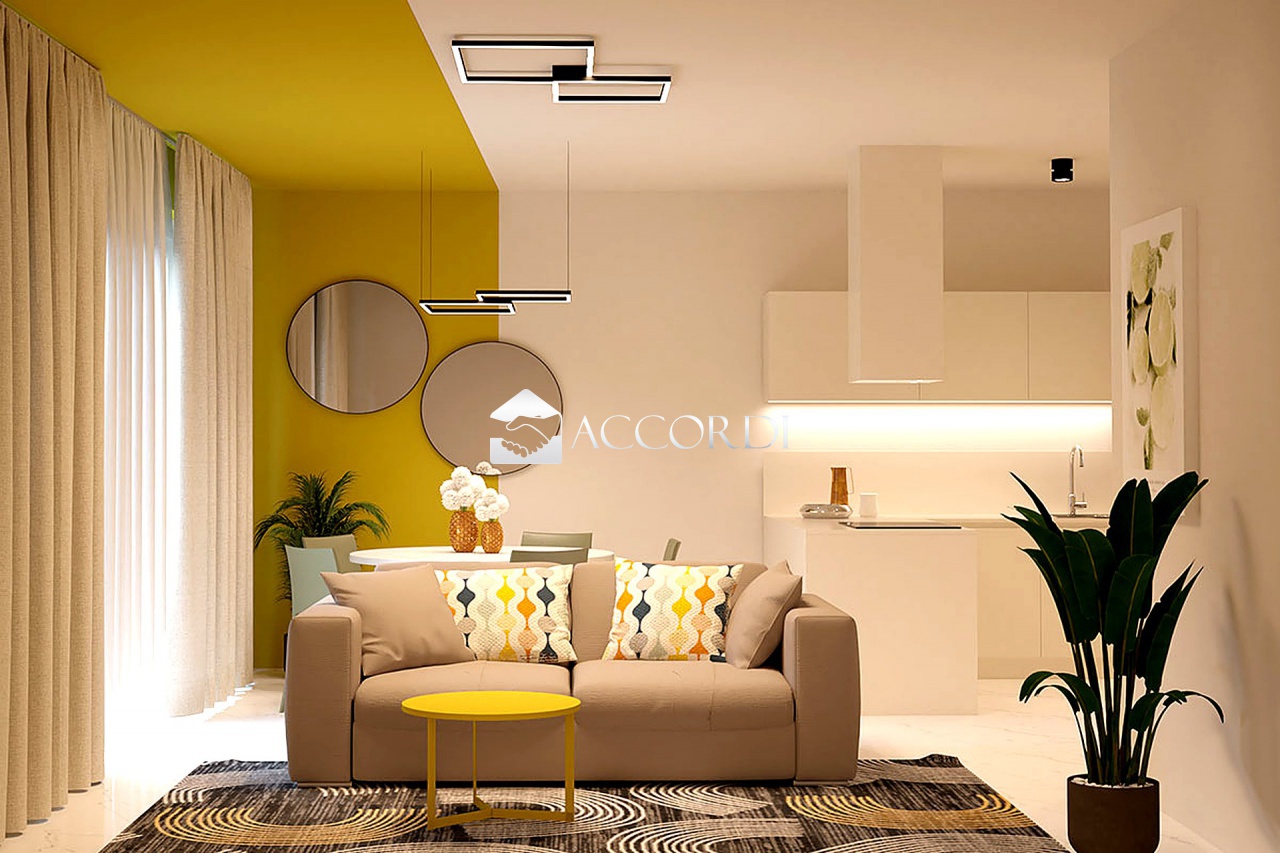 L'appartamento sarà composto da: cucina - soggiorno, camera matrimoniale e camera singola, bagno con anti/lavanderia, loggia coperta e scoperto/giardino privato, il tutto al piano terra.