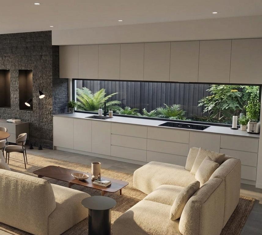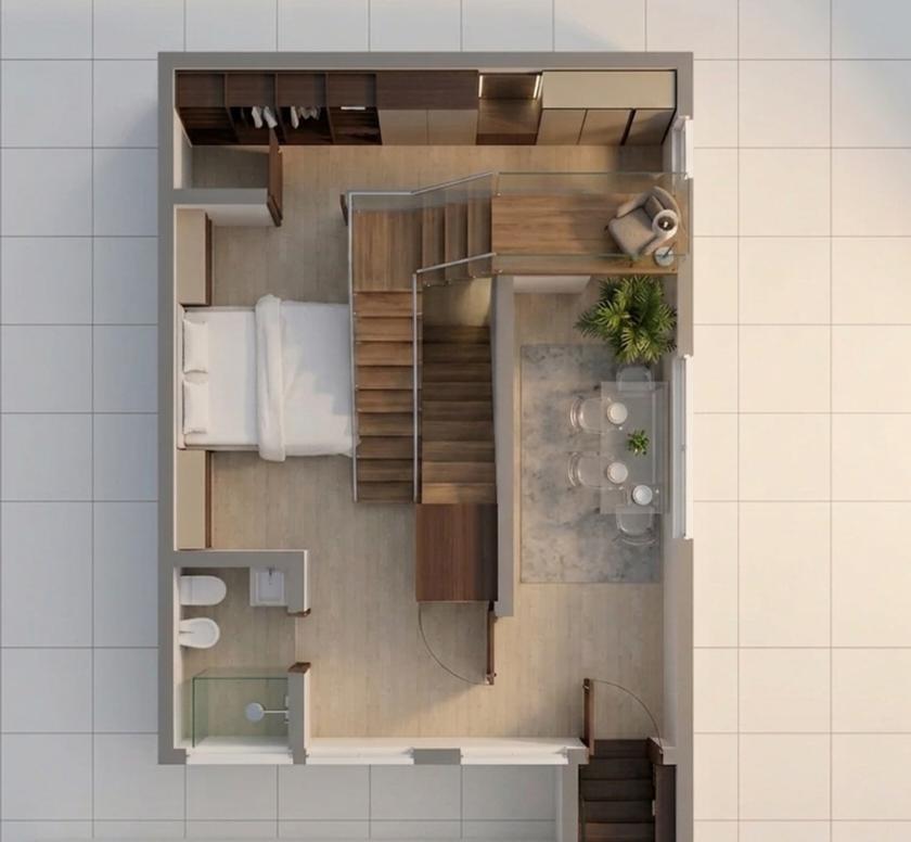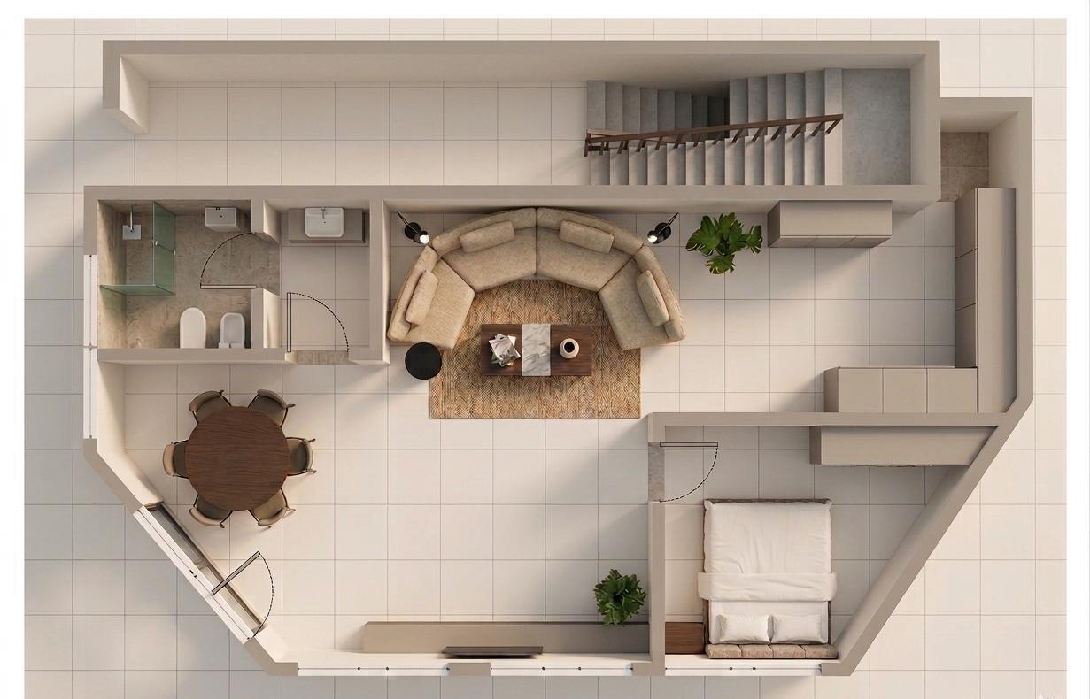 Il piano terra accoglie un ampio e luminoso open space, progettato per offrire convivialità e stile, con una grande zona living che integra armoniosamente cucina e zona giorno, oltre a una spaziosa camera matrimoniale.