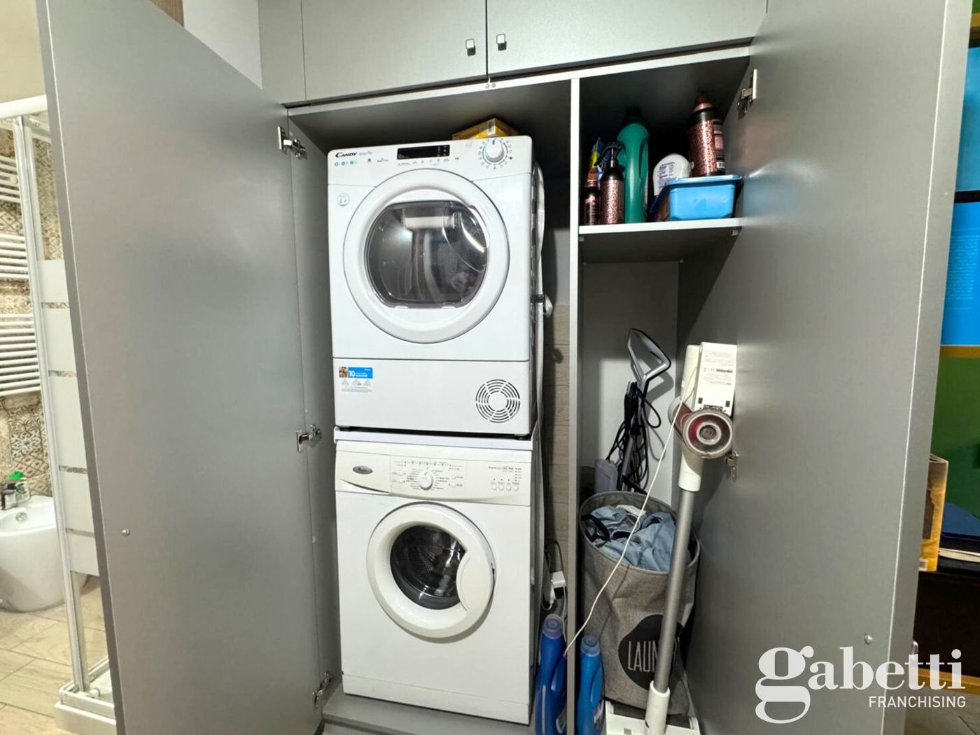 La soluzione, si sviluppa in: zona living con cucina a vista, camera da letto con cabina armandio, cameretta, ripostiglio e doppio bagno.