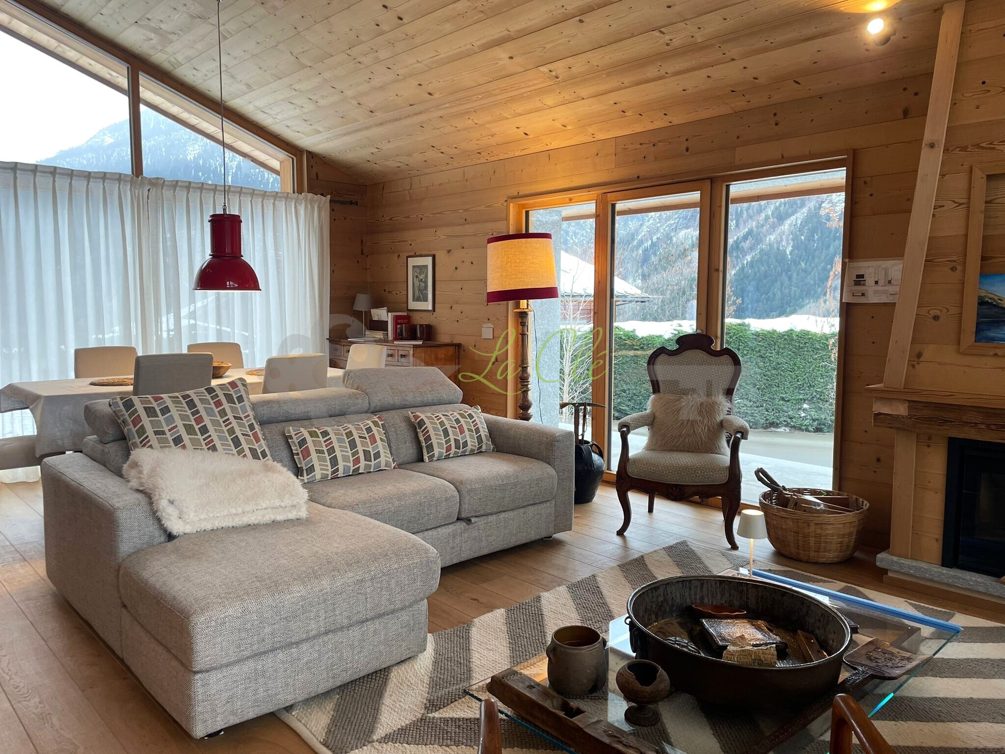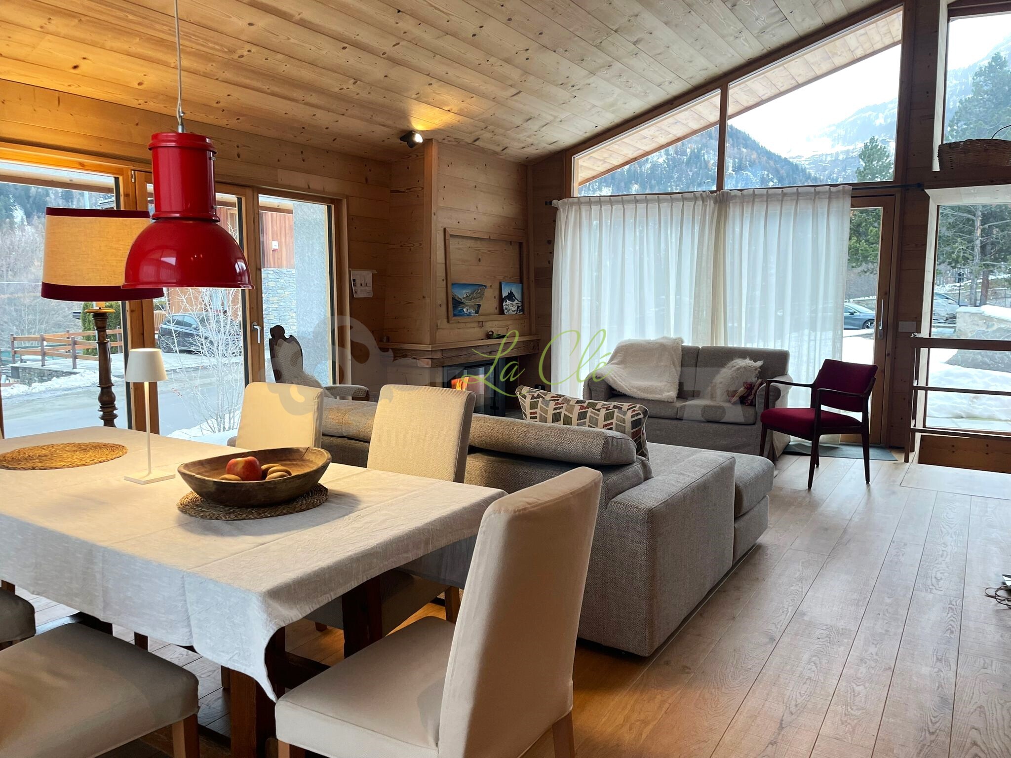 AFFITTO - PORZIONE DI CHALET COMPLETAMENTE RISTRUTTURATO E LUMINOSO CON VISTA SUL MONTE BIANCO La Clé immobiliare e servizi, propone una soluzione elegante completamente ristrutturata, caratterizzata da finiture in legno di alta qualità e da ampie vetrate che garantiscono luminosità naturale in ogni ambiente, così composto: ingresso su ampio soggiorno con camino e zona pranzo, la cucina a vista, moderna e completamente accessoriata (frigo, forno, lavastoviglie). La zona notte è composta da due camere matrimoniali e due bagni completi dotati di box doccia.