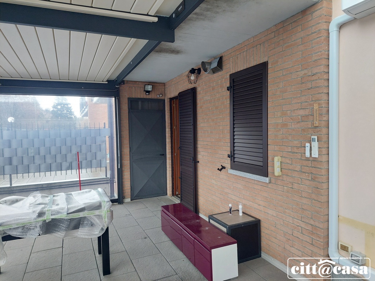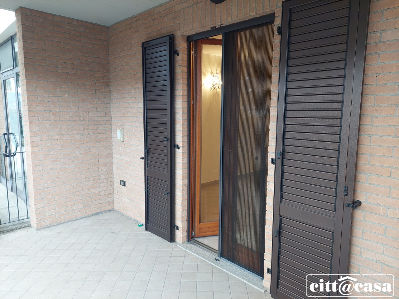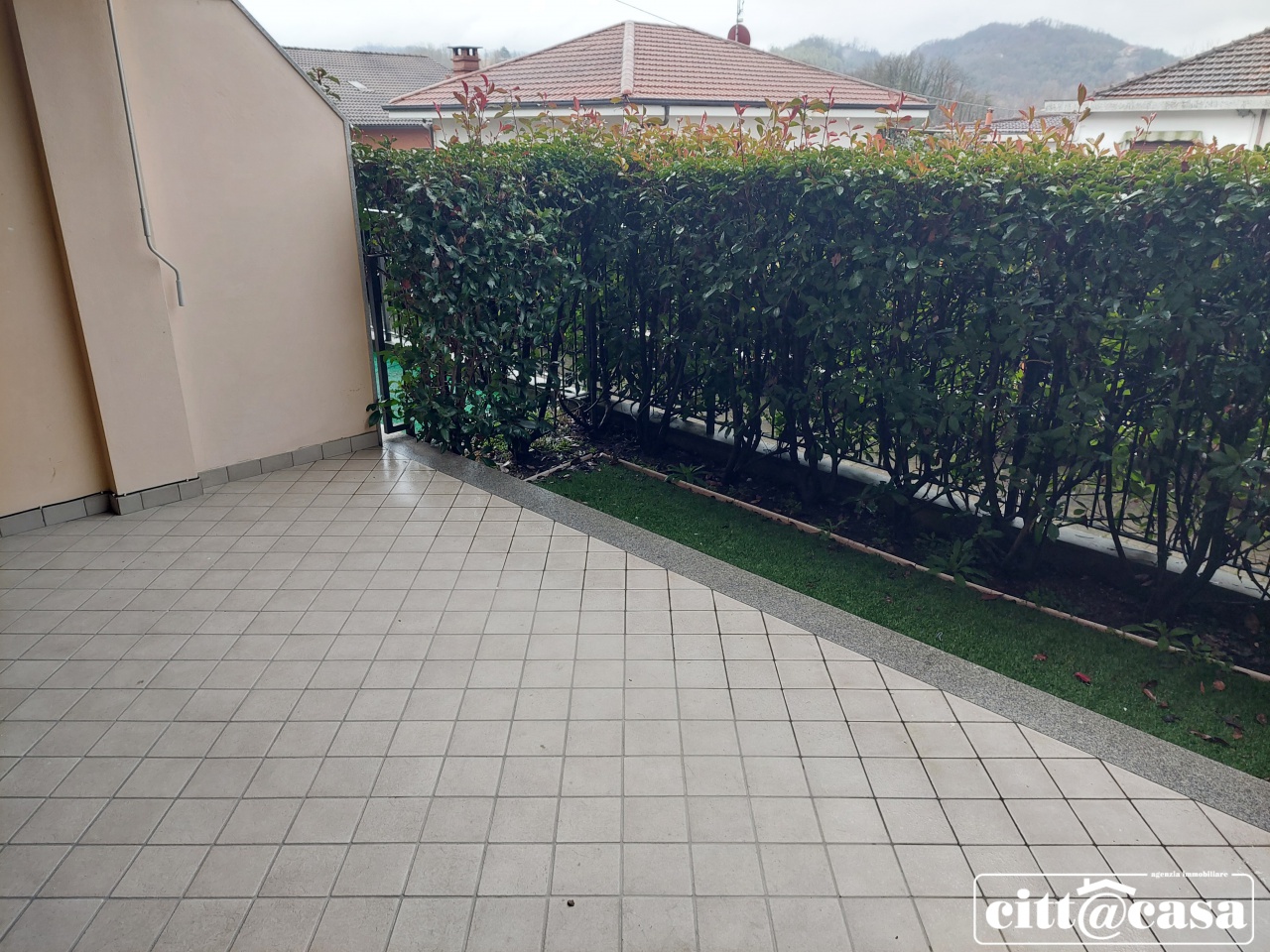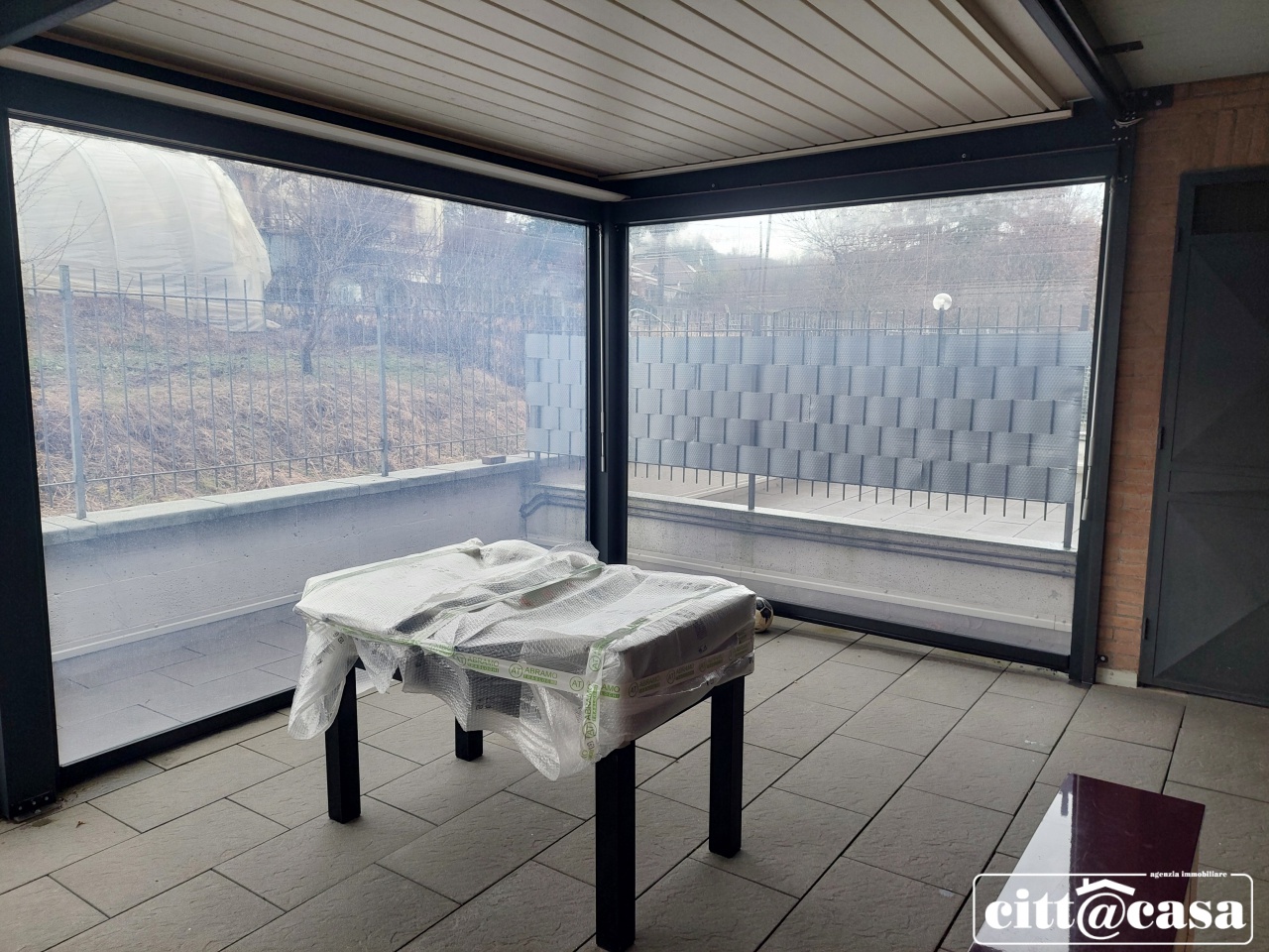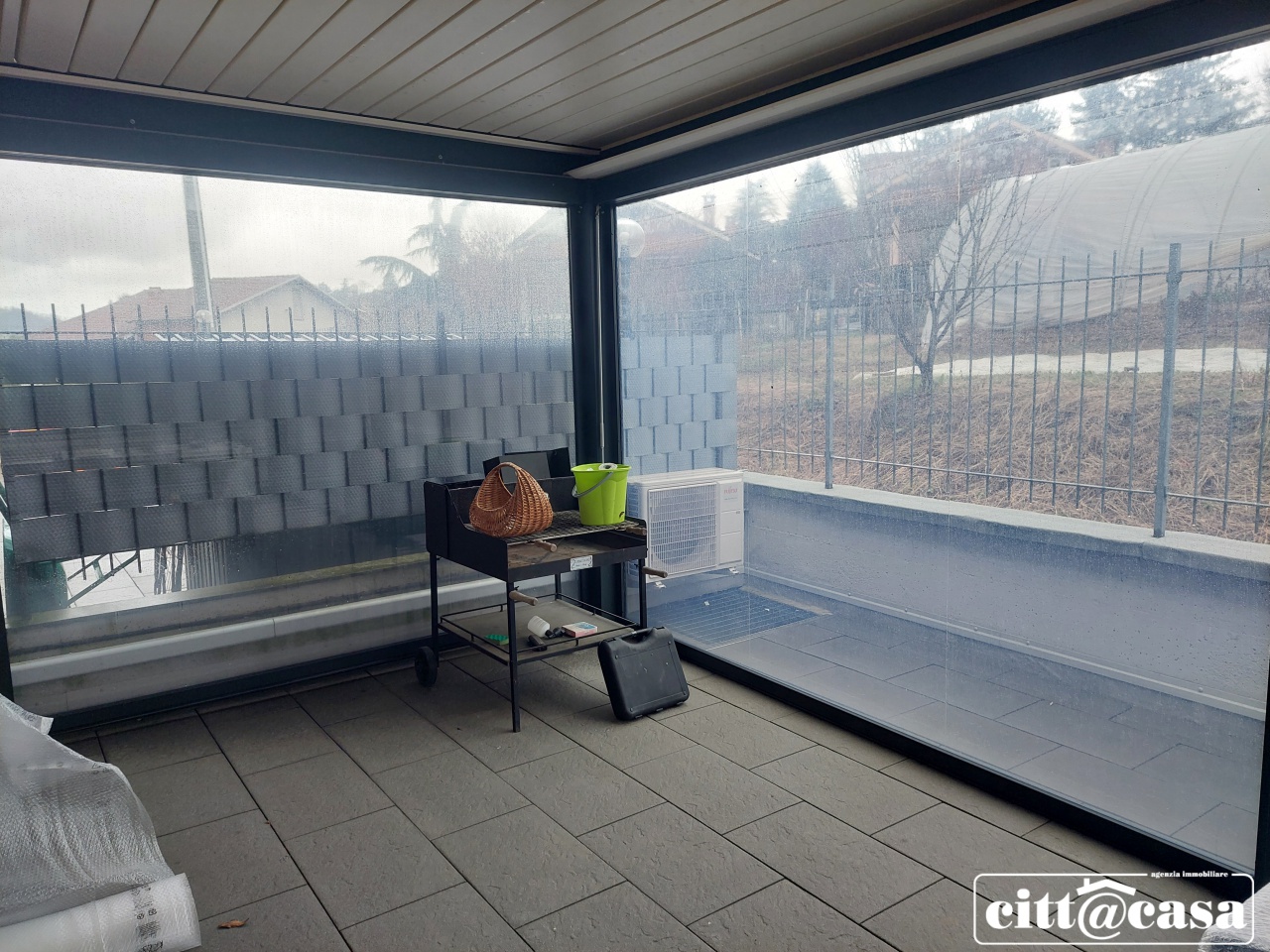 Località San Rocco, a due passi dal supermercato Crai, proponiamo in vendita alloggio posto al piano terreno con area esterna privata avanti/dietro, sito in un complesso di recente edificazione (2006). L'alloggio è composto da ingresso su soggiorno con angolo cottura, disimpegno, due camere e bagno; lato sud terrazzo con piccolo fazzoletto di giardino, lato nord grande terrazzo in pavimento galleggiante con tenda-veranda bioclimatica completamente apribile.