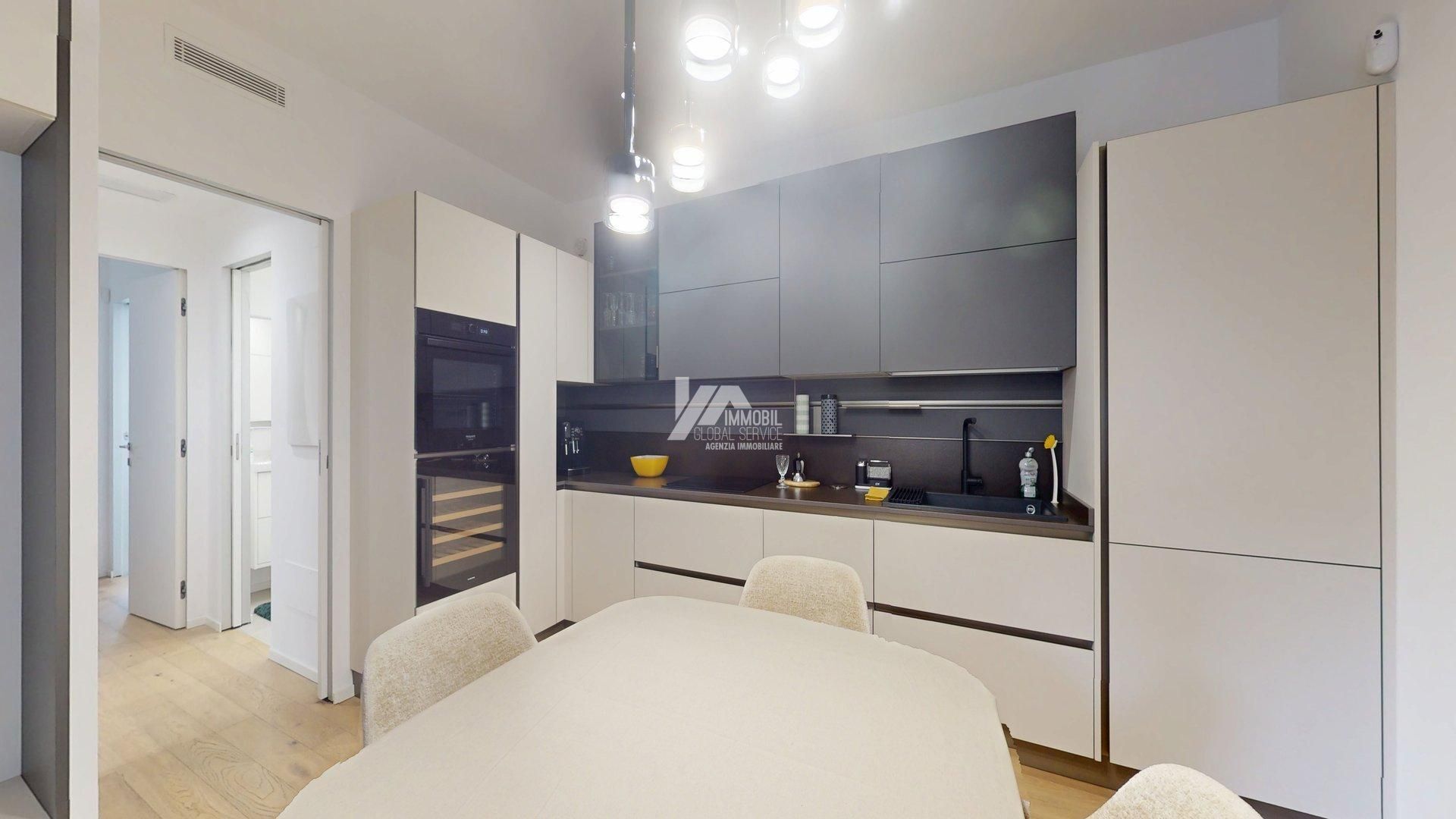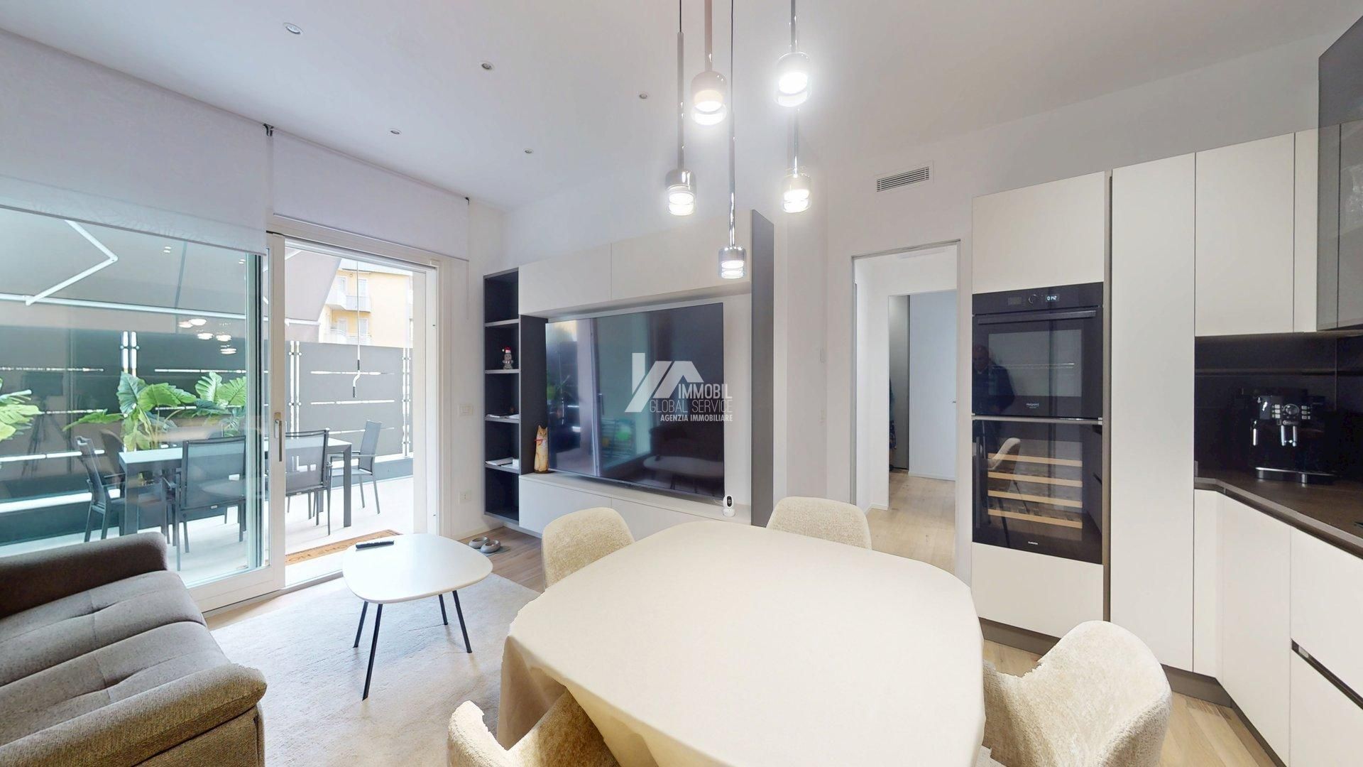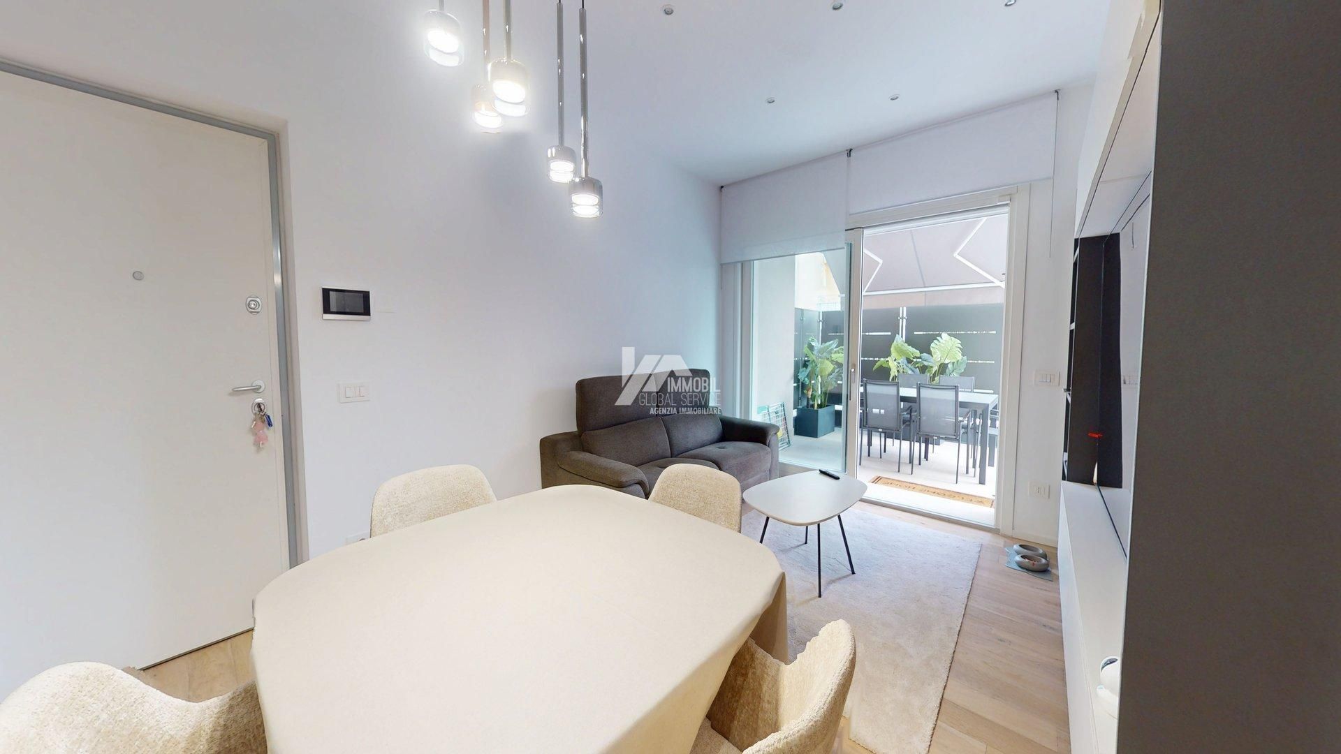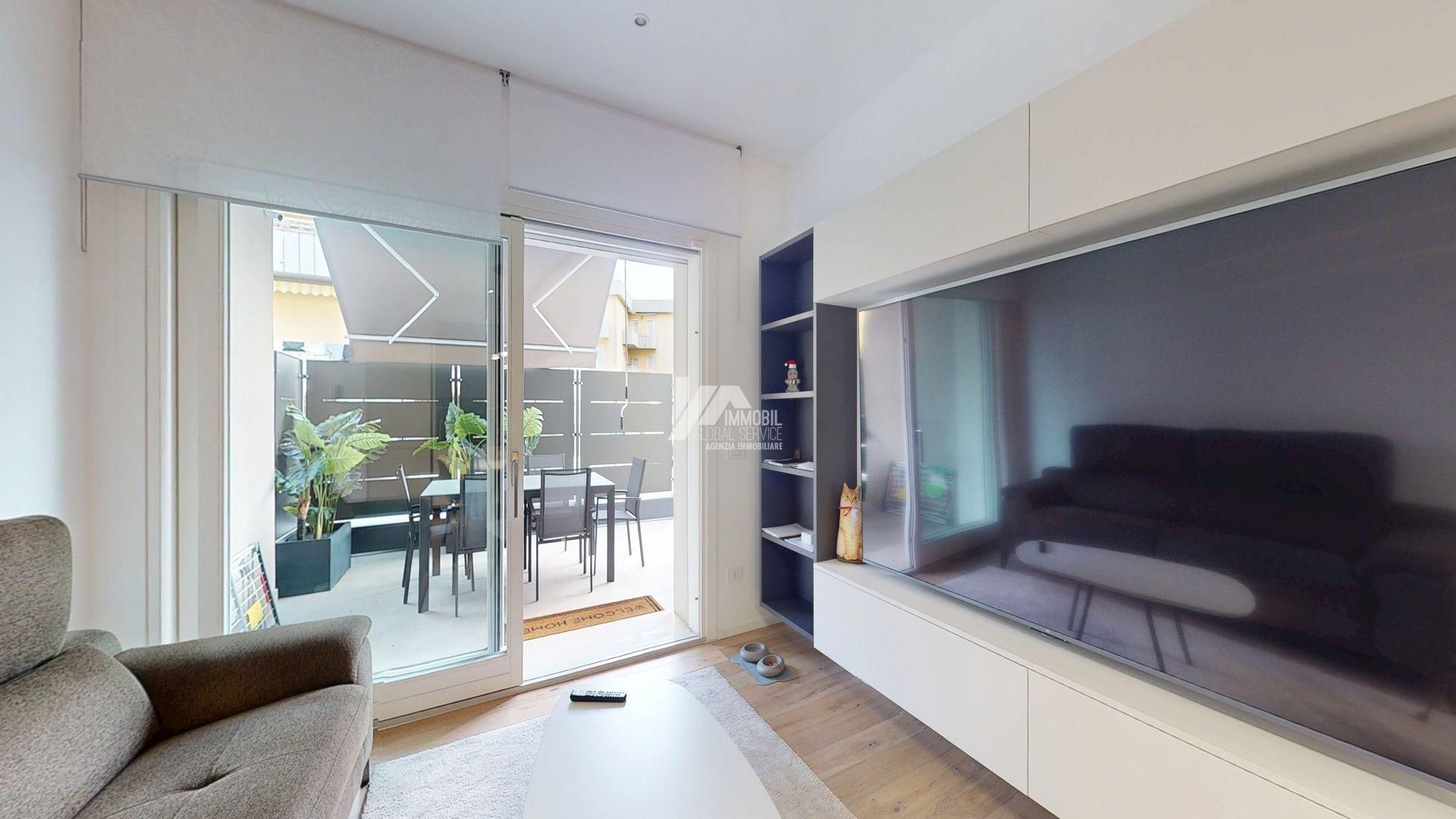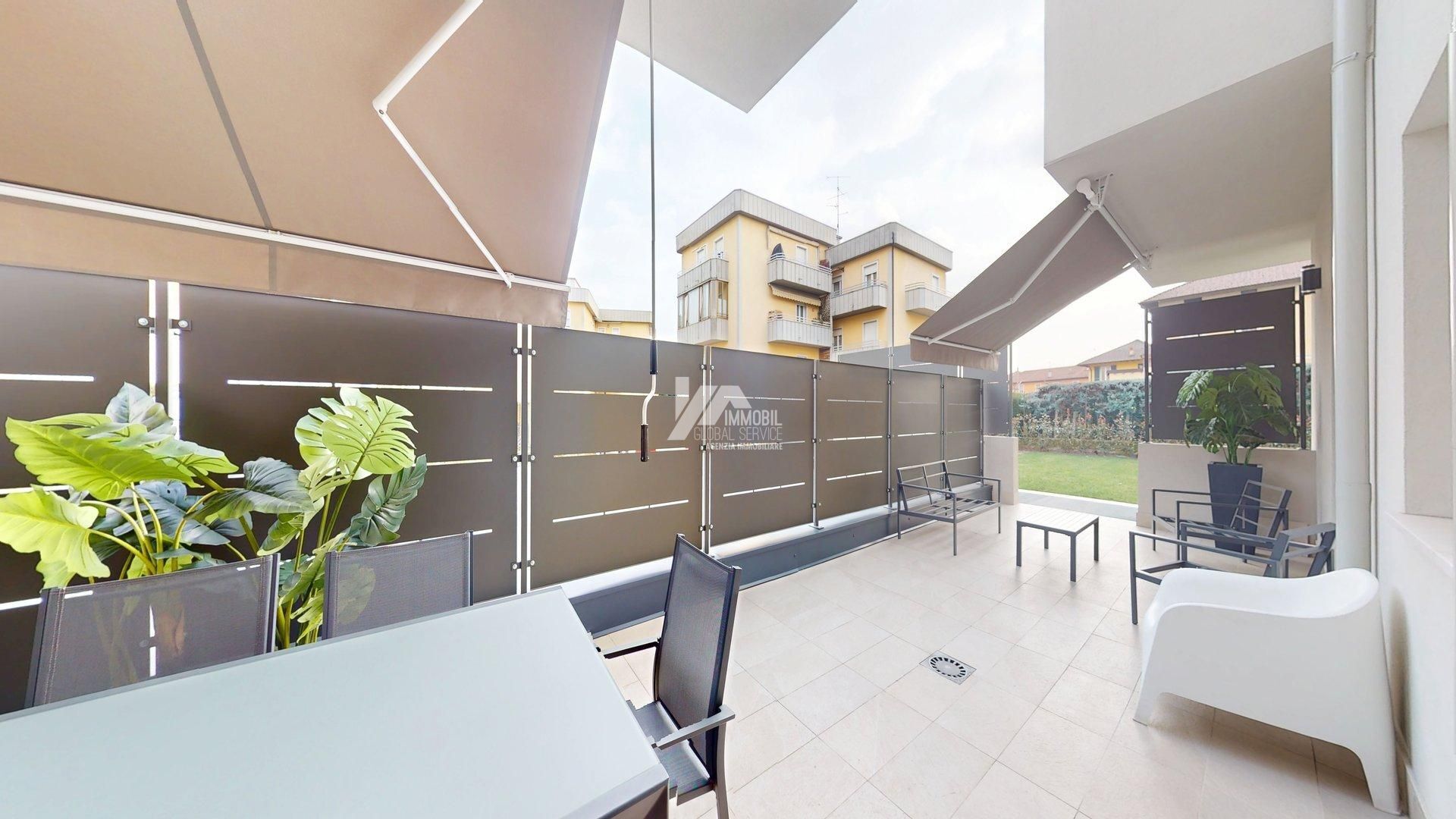 Lappartamento è così composto: Luminoso soggiorno con cucina a vista Due camere da letto Doppi servizi, di cui uno adibito a lavanderia Ampio terrazzo esterno di generosa metratura Splendido giardino privato di circa 300 mq, recentemente piantumato e seminato con tappeto erboso Completano la proprietà: Impianto di irrigazione Impianto di illuminazione esterna Sistema semi-domotico Ampio box auto nellinterrato con basculante elettrica marca Peli Predisposizione per colonnina di ricarica auto elettrica Limmobile sarà disponibile entro 4 mesi dalla liberazione.