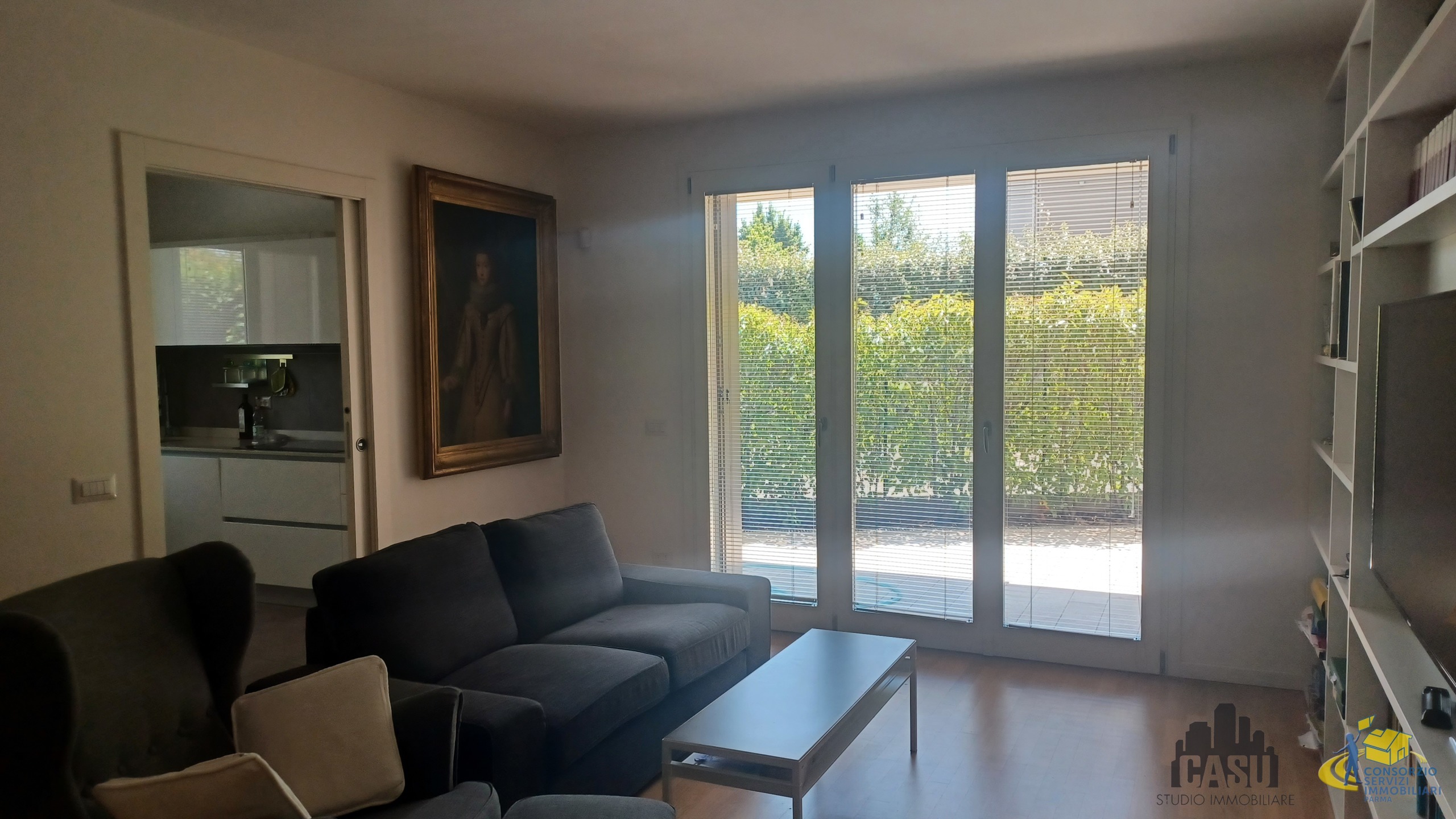 L'appartamento dispone di un'area privata esterna di proprietà con accesso indipendente ora pavimentata ed eventualmente da adibire a giardino.