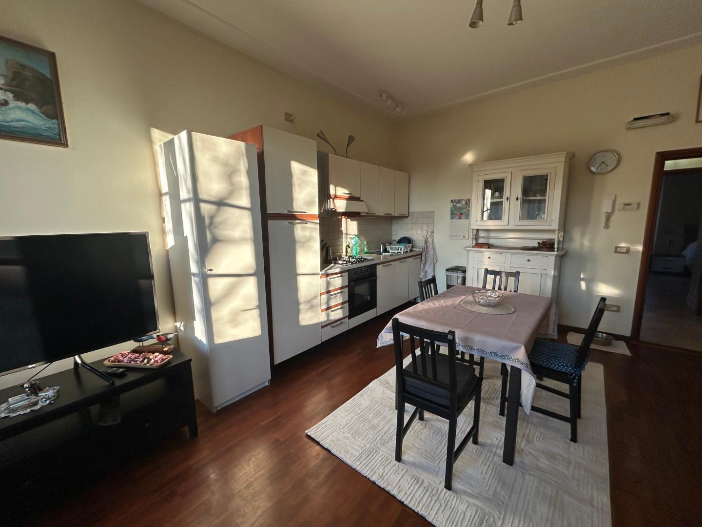 All'interno si trova una ampia zona soggiorno-cucina, particolarmente luminosa grazie all'ottima esposizione, disimpegno, camera singola/studio, camera matrimoniale con accesso al secondo terrazzo, bagno finestrato con doccia, e comodo ripostiglio/lavanderia.