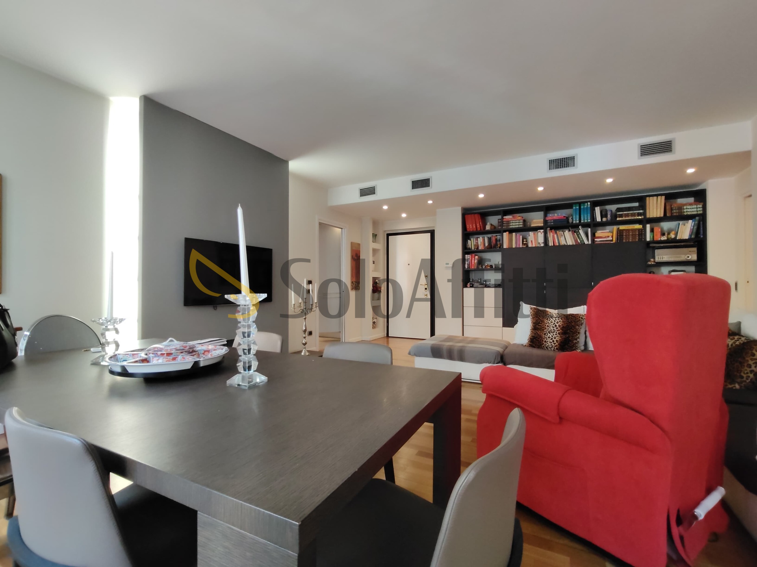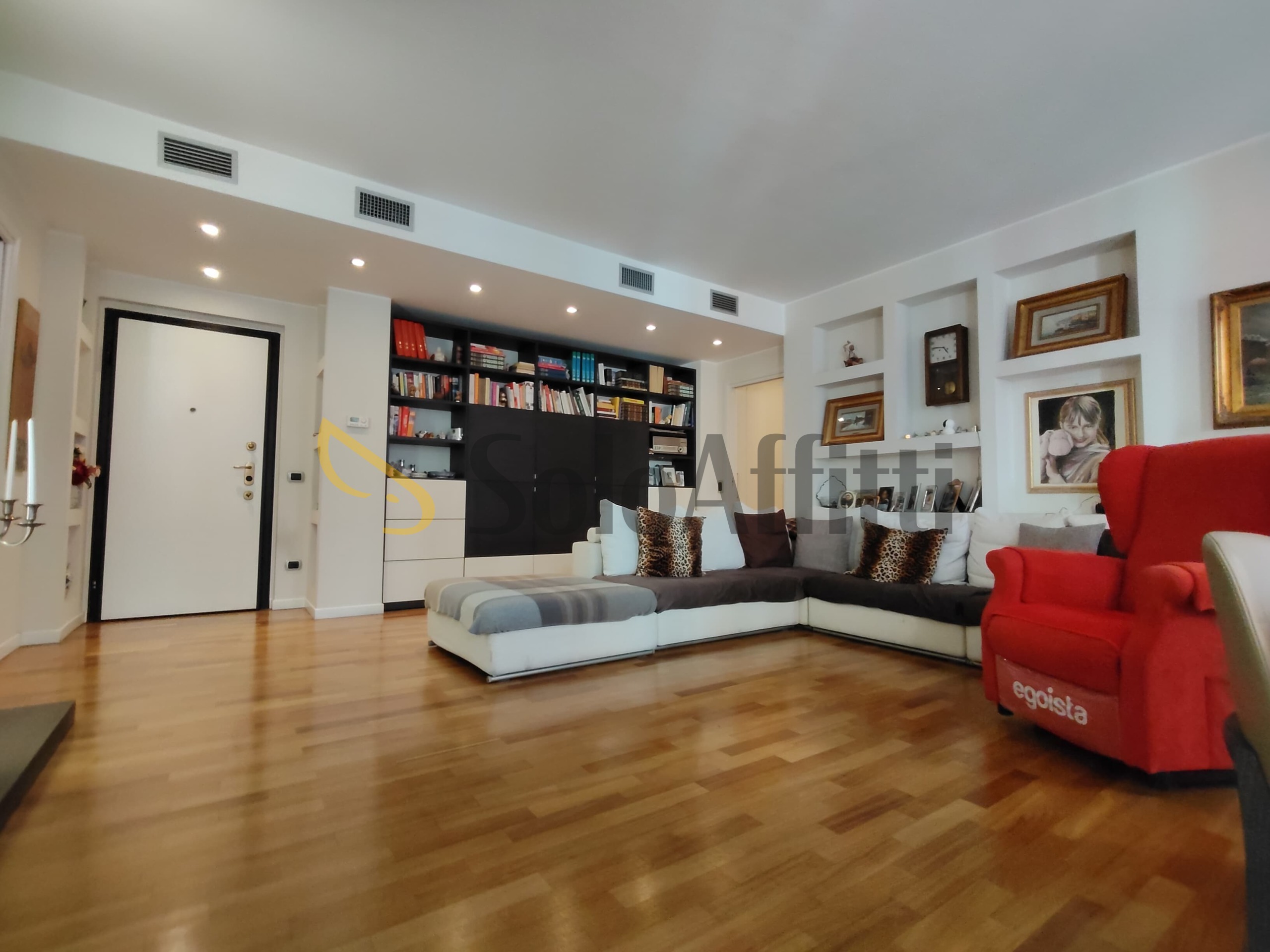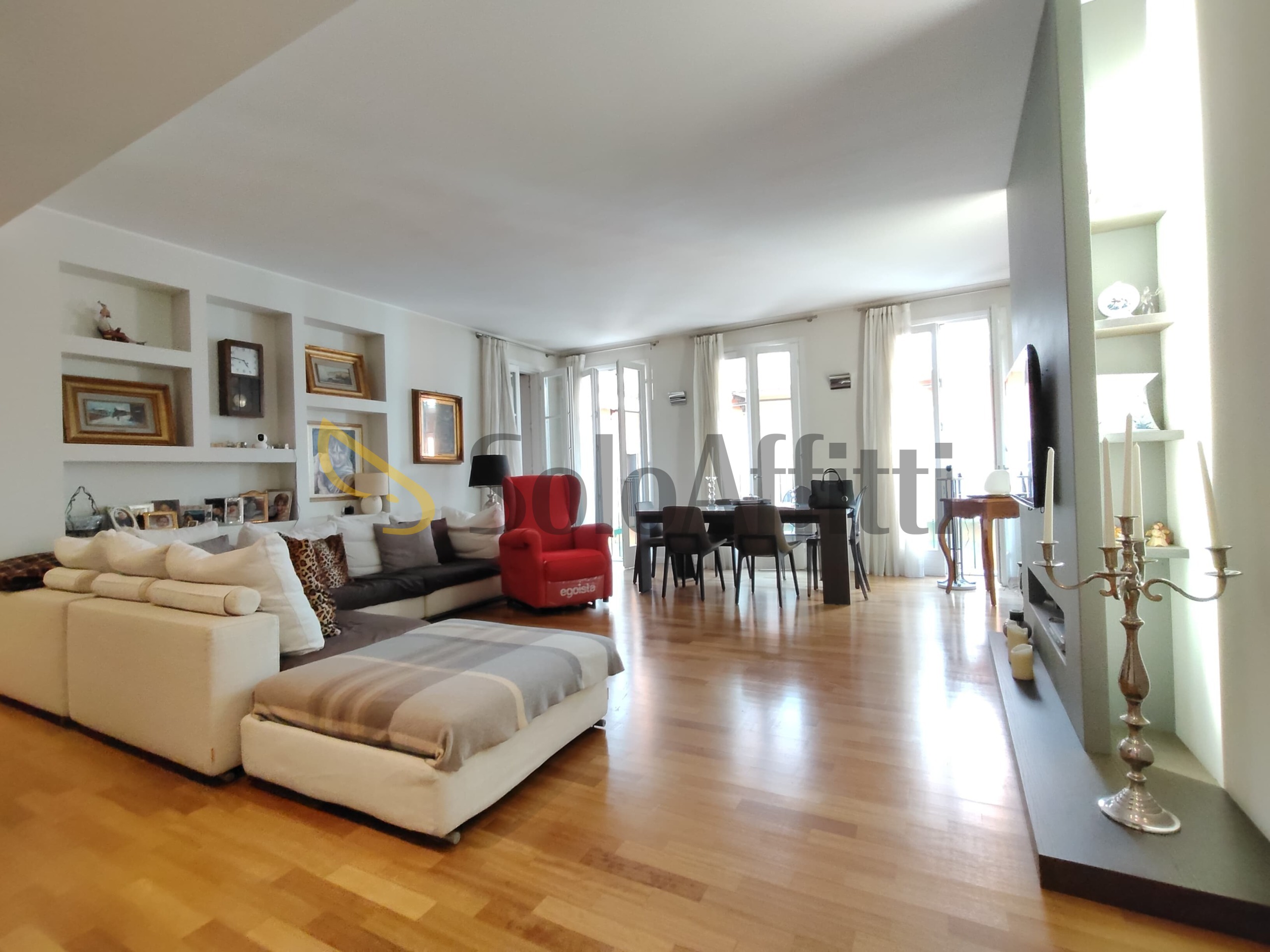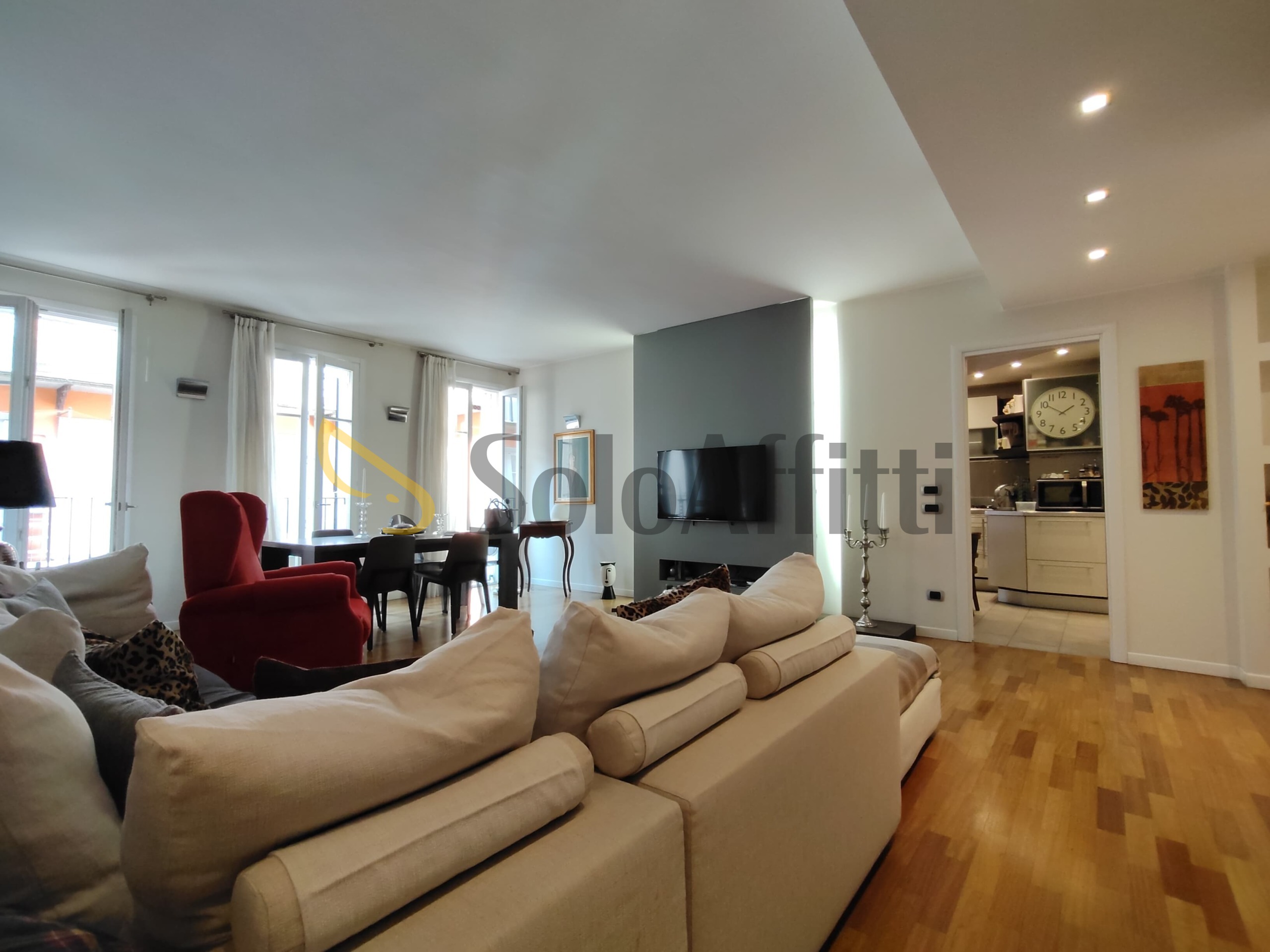 In pieno centro, al 2° piano con ascensore, proponiamo in locazione APPARTAMENTO di circa 130 mq, arredato con cura al dettaglio, composto da ingresso in spaziosa zona living con terrazzo che affaccia sulla corte interna, cucina abitabile anch'essa con terrazzino, corridoio con armadio a muro a tutta lunghezza, cameretta, bagno di servizio con doccia tramite il quale si accede anche alla zona lavanderia dotata di lavatrice ed asciugatrice e camera padronale con ampio bagno privato dotato di vasca e doccia separate.
