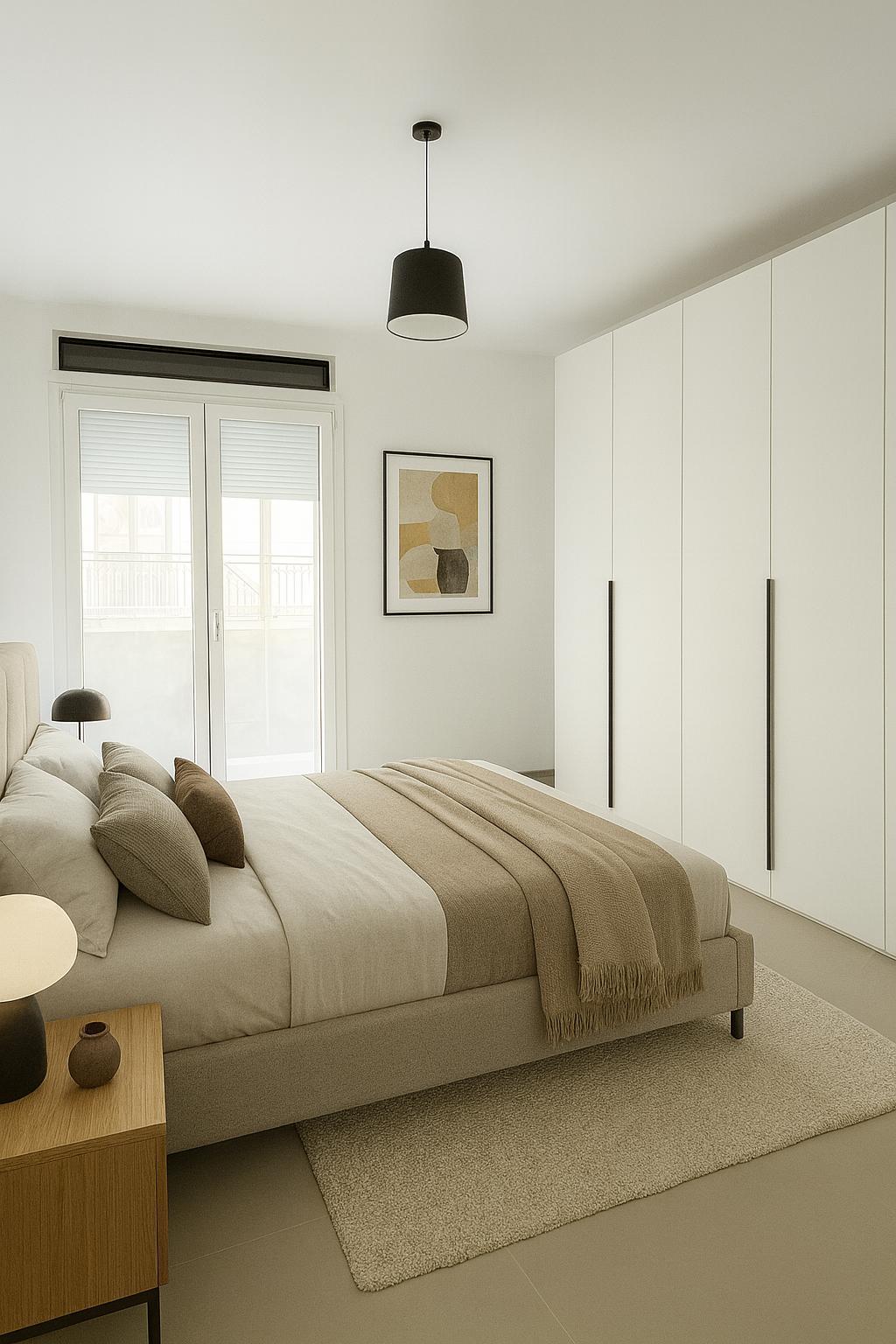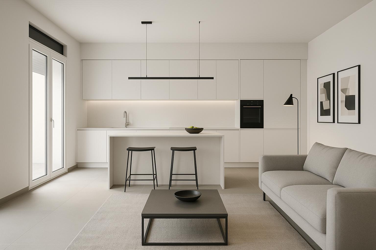 Gli spazi interni si articolano in un ampio open space con cucina a vista, due camere da letto entrambe con cabina armadio, due servizi e un comodo balcone abitabile.