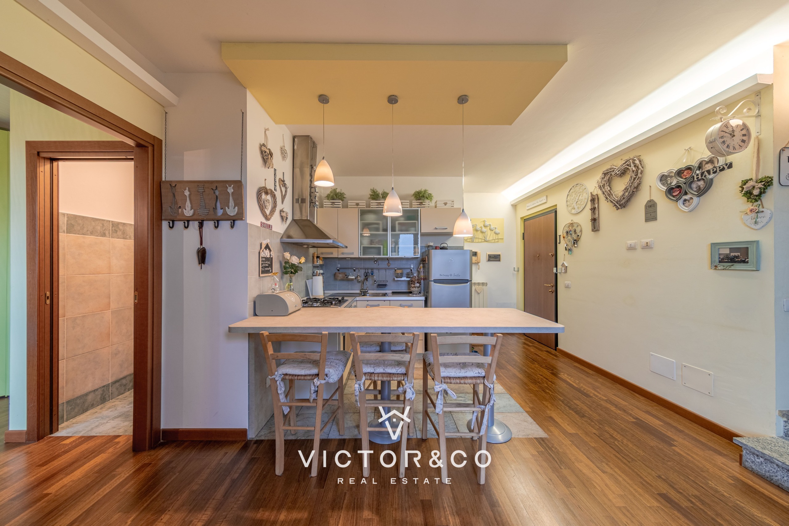 Varcata la soglia, sarai accolto da un ambiente contemporaneo e luminoso, dove il soggiorno con cucina open space crea uno spazio conviviale perfetto per la tua quotidianità insieme al balcone esposto ad ovest.