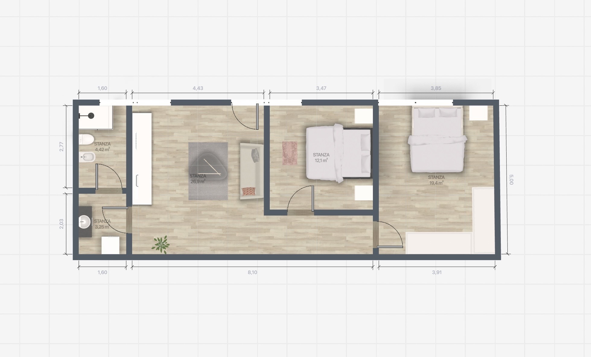 Limmobile si presta perfettamente alla realizzazione di un trilocale moderno e accogliente, con una zona giorno luminosa composta da cucina e soggiorno in open space e due zone notte ben distribuite con più ambienti, mantenendo sempre una sensazione di armonia e funzionalità. Lingresso indipendente garantisce privacy e autonomia, mentre lassenza di spese condominiali rappresenta un valore aggiunto sempre più ricercato.