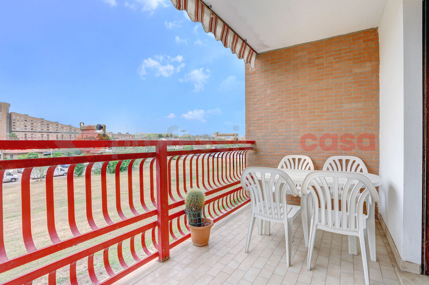 La disposizione interna prevede: soggiorno e cucina separata, entrambi con accesso diretto al balcone principale; due camere da letto spaziose; due bagni, di cui uno con balcone di servizio.