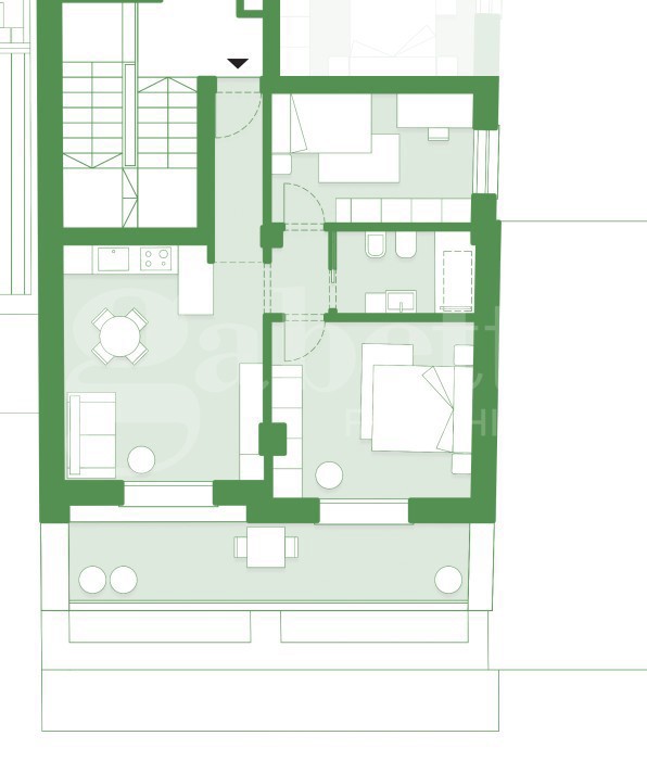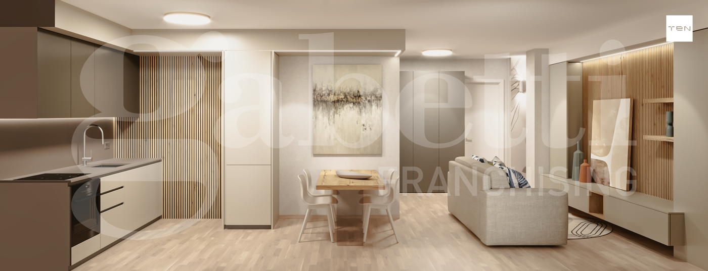 CONSEGNA FINE 2027. Labitazione si distingue per una distribuzione interna funzionale e contemporanea, con ampia zona living con soggiorno angolo cucina, 2 camere da letto, bagno dotato di velux elettrico.