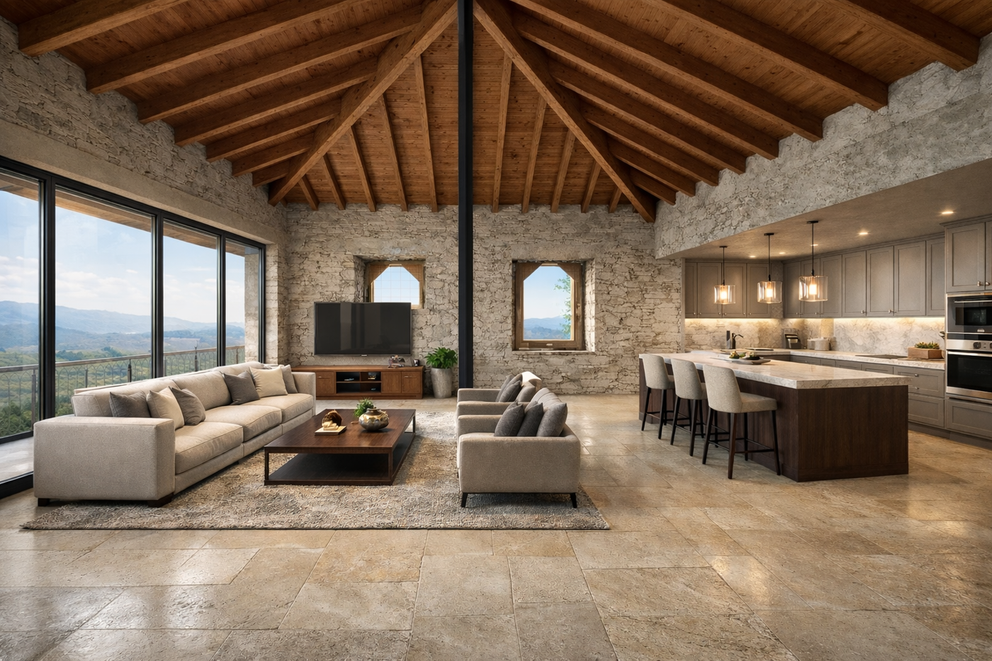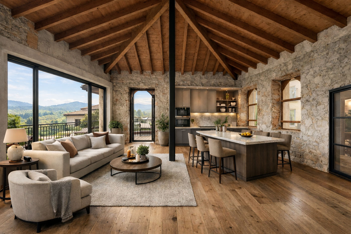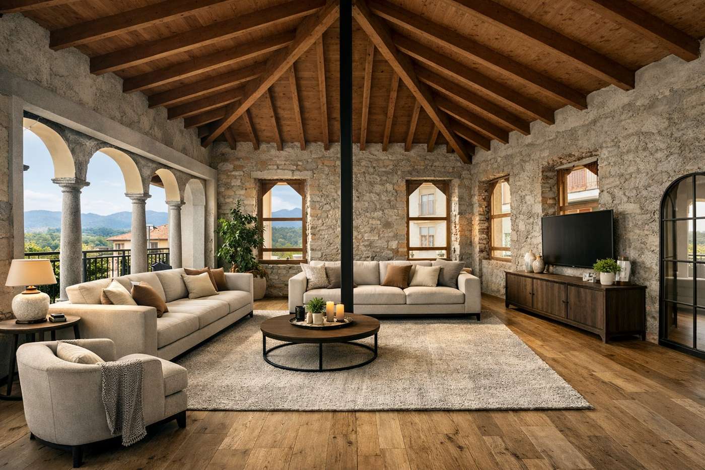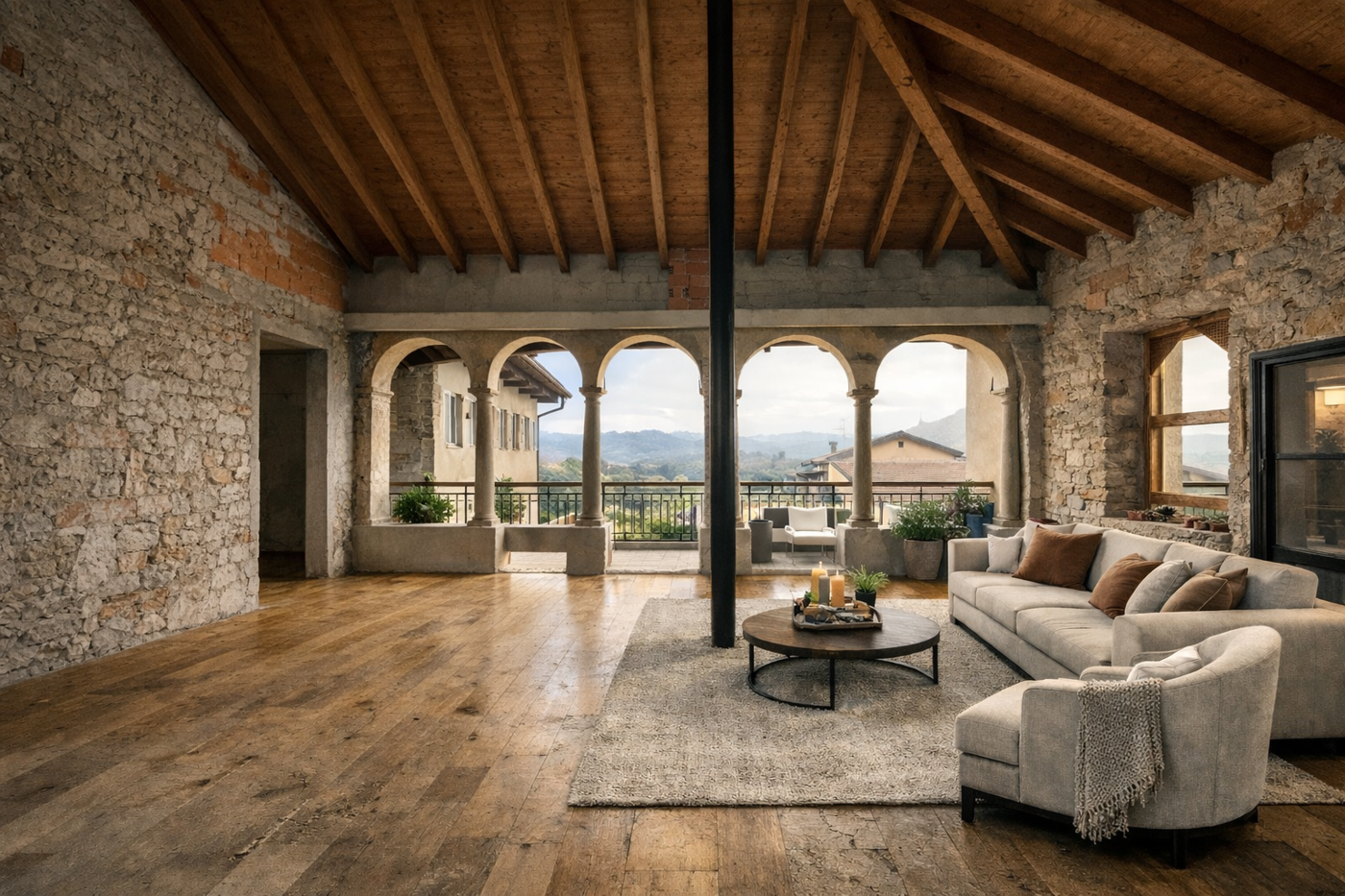 Lappartamento si distingue per gli spazi molto ampi e luminosi: lingresso si apre su un grande soggiorno con cucina a vista di 80 mq, valorizzato da un suggestivo soffitto alto circa 8 metri che dona grande respiro e carattere allambiente.