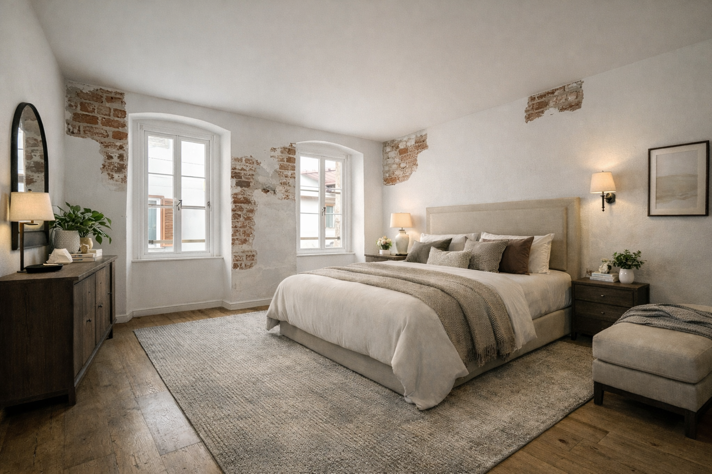 Il bagno, di generose dimensioni, finestrato e rifinito con cura. Limmobile presenta dettagli architettonici di pregio, come archi e colonne, che conferiscono eleganza e unicit agli spazi.