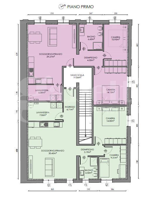 Gli appartamenti sono composti da sala/cucina, 2 camere, bagno, e vano tecnico lavanderia.