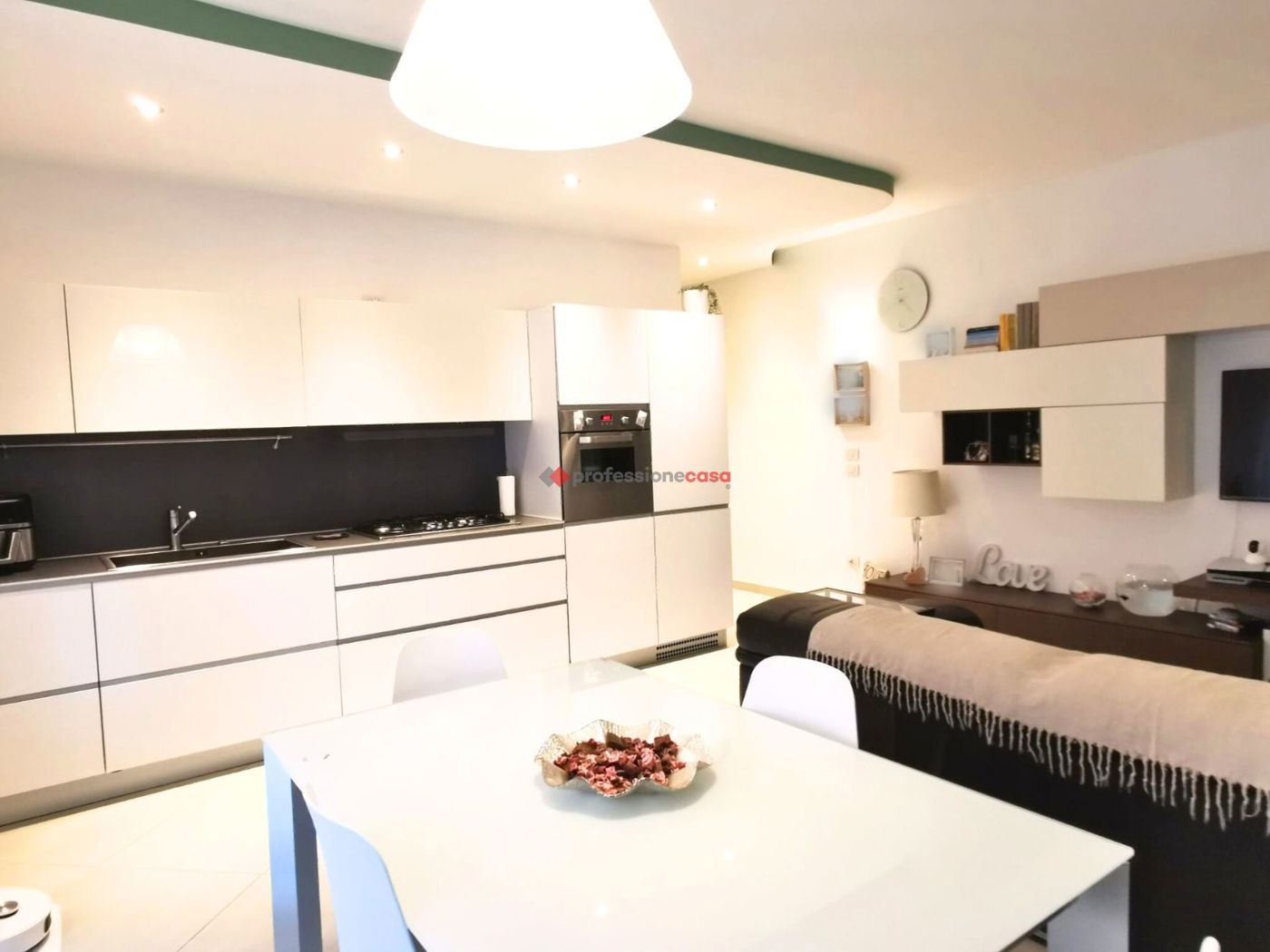 Distribuzione degli spazi: Zona Giorno: Ingresso su Sala a vista con angolo cottura, caratterizzata da controsoffittature con illuminazione integrata.