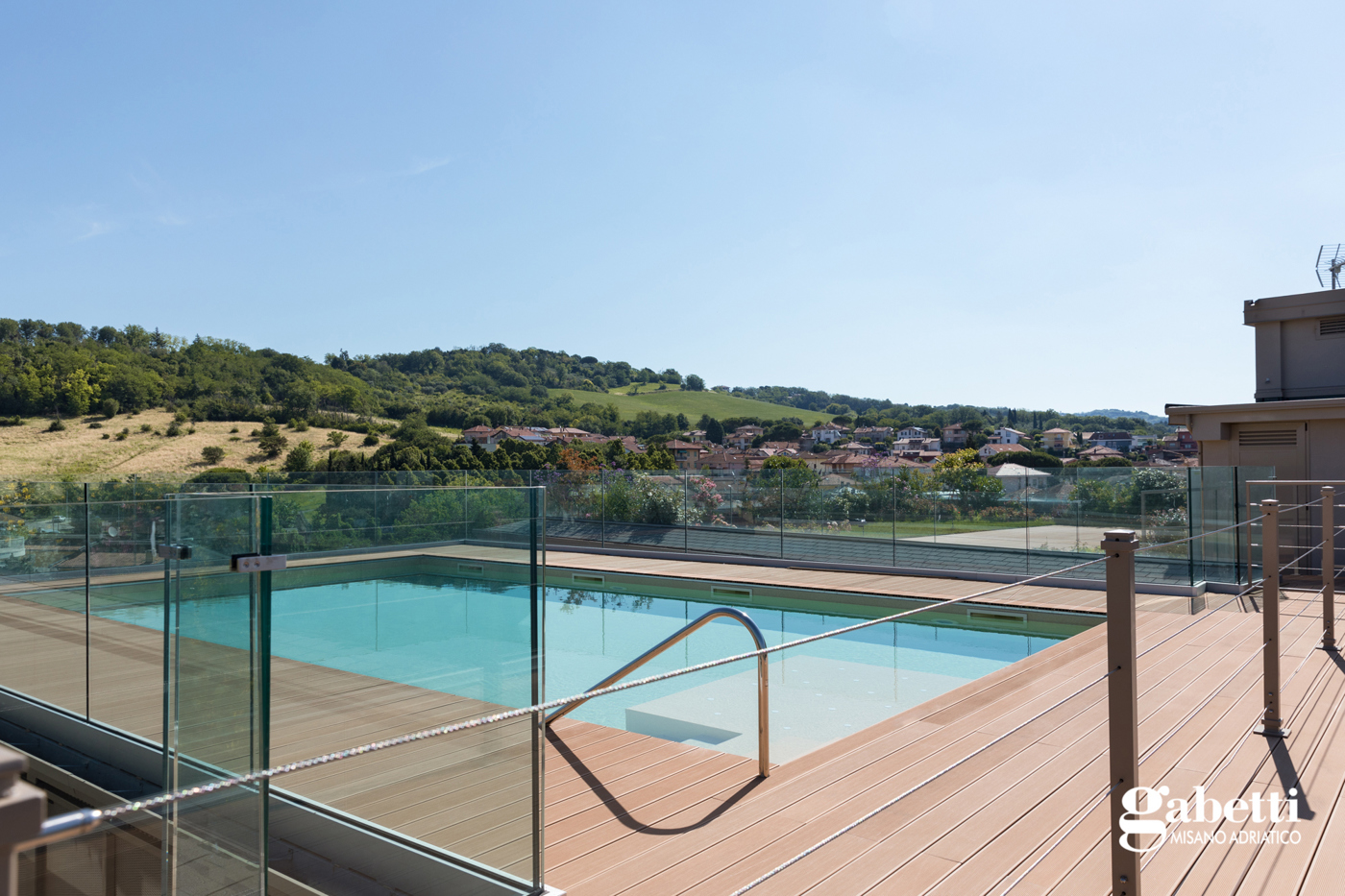I confort di questa propriet si completano grazie all'accesso allo splendido terrazzo panoramico con piscina e giardino pensile dal quale si possono ammirare Gradara e il suo Castello, il parco naturale del Monte San Bartolo e il profilo delle iconiche torri di San Marino.