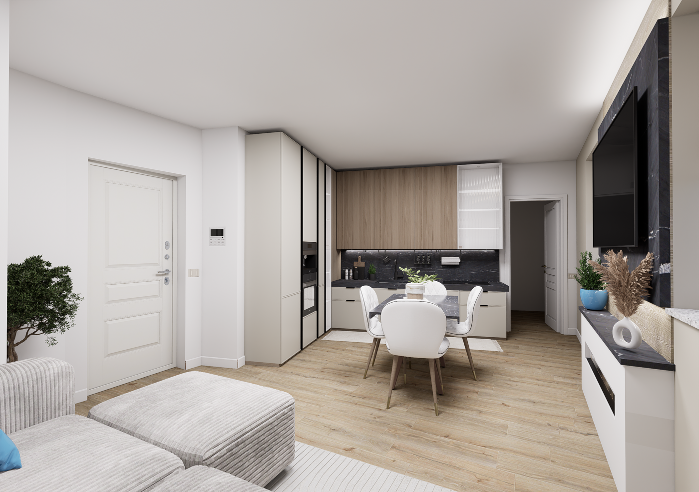 APP. A: bilocale al piano terra con taverna: mq 105; soggiorno con cucina a vista, bagno con doccia, camera matrimoniale e taverna con bagno.