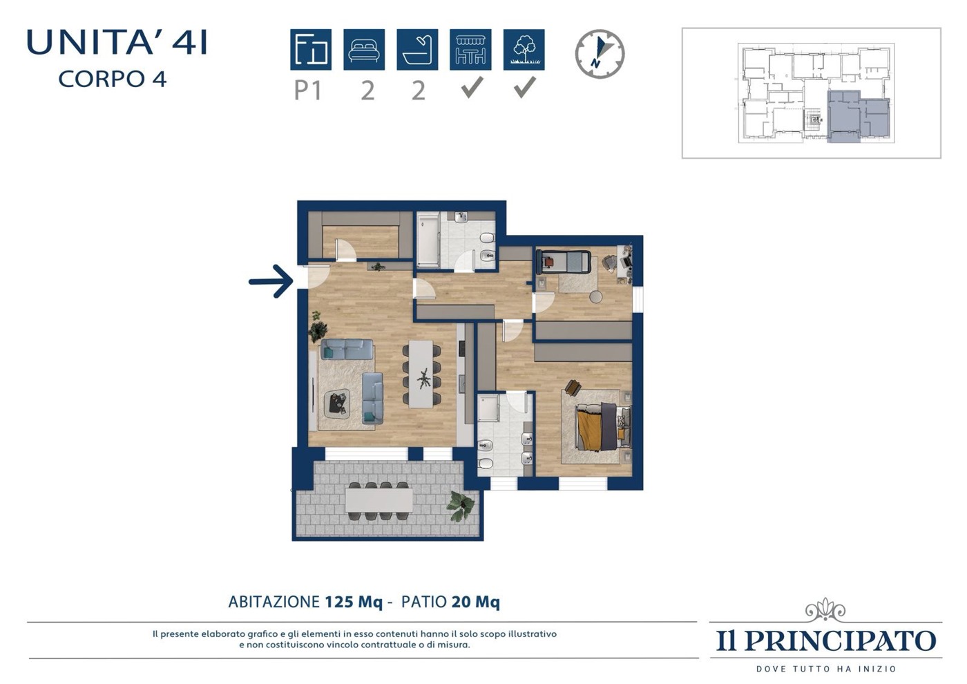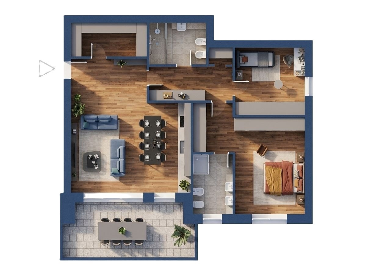 Labitazione si compone di ingresso nell'ampia zona giorno open space con cucina a vista, un pratico ripostiglio all'ingresso da utilizzare come armadiatura o cappottiera, ed uscita sul terrazzo di 20 mq; il disimpegno conduce alla zona notte che vanta una camera matrimoniale con bagno privato, una cameretta ed un secondo bagno.