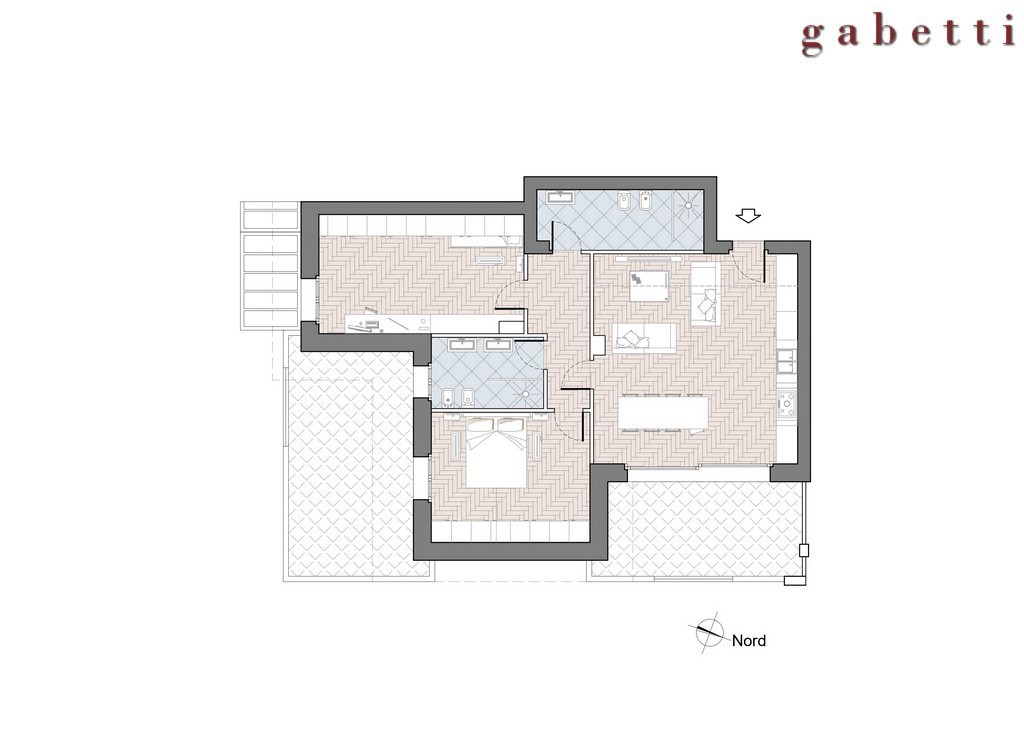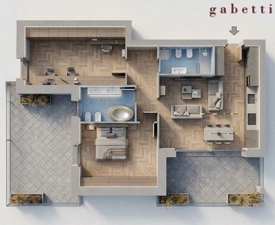 Si compone di una zona giorno open space con cucina a vista, il disimpegno conduce alla zona notte che vanta una camera matrimoniale, una cameretta, un bagno ed un secondo bagno/lavanderia.