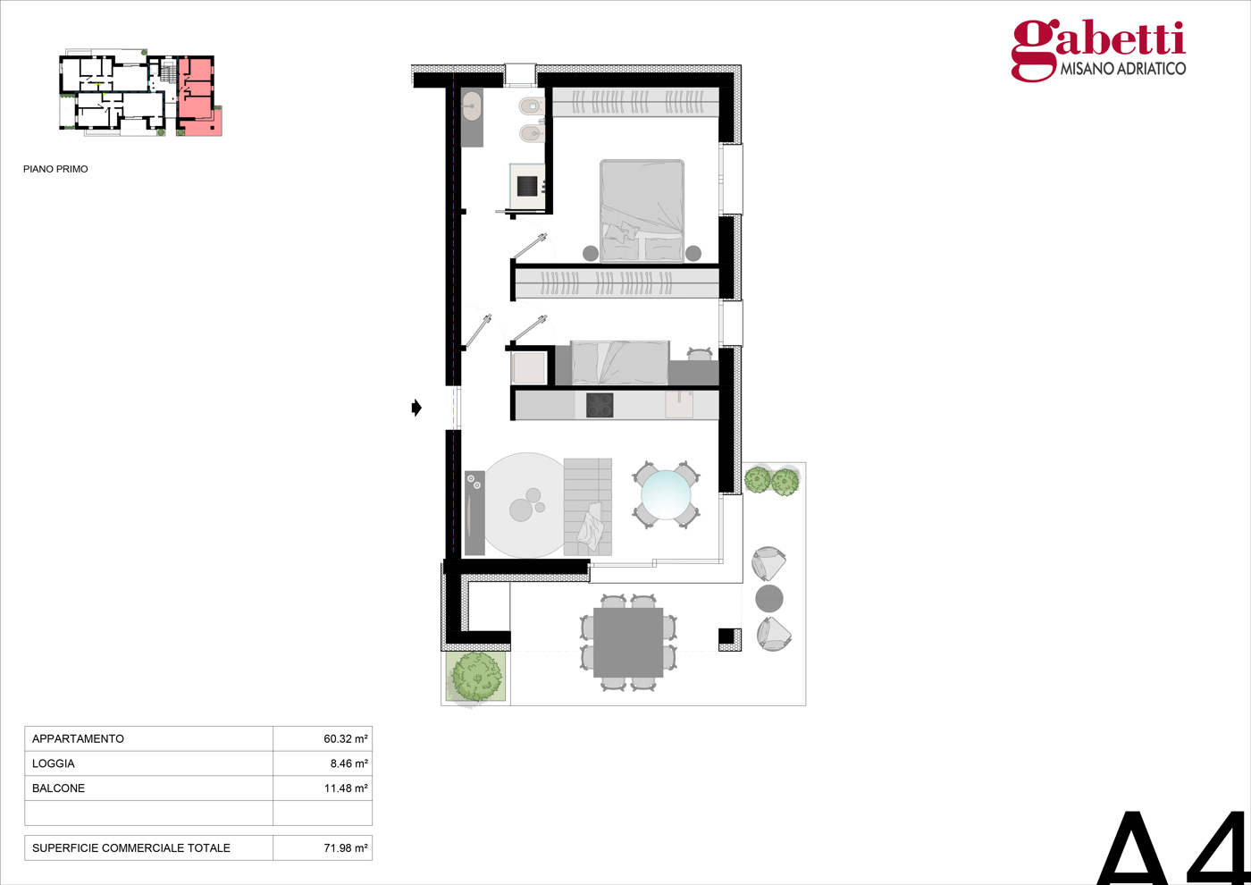 L'appartamento A4, situato al primo piano, una soluzione dove il design contemporaneo incontra la vivibilit in ogni stagione.