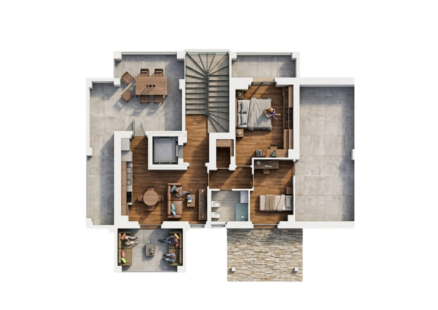 Gli spazi interni si sviluppano attorno ad un luminosissimo soggiorno cucina in stile open space, pensato come cuore della casa e naturalmente proiettato verso l'esterno grazie all'affaccio sulle terrazze.