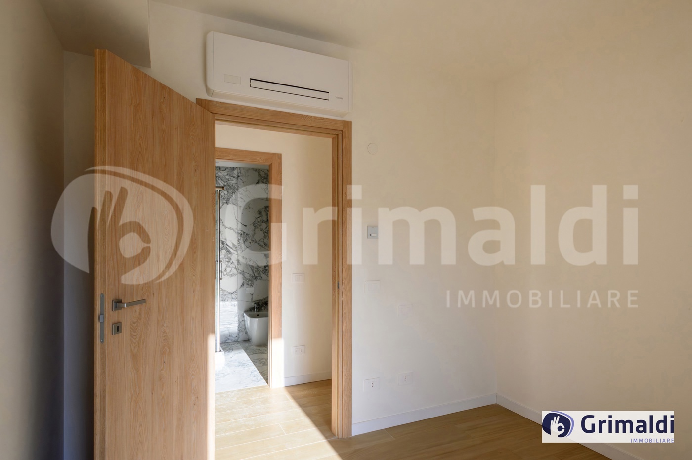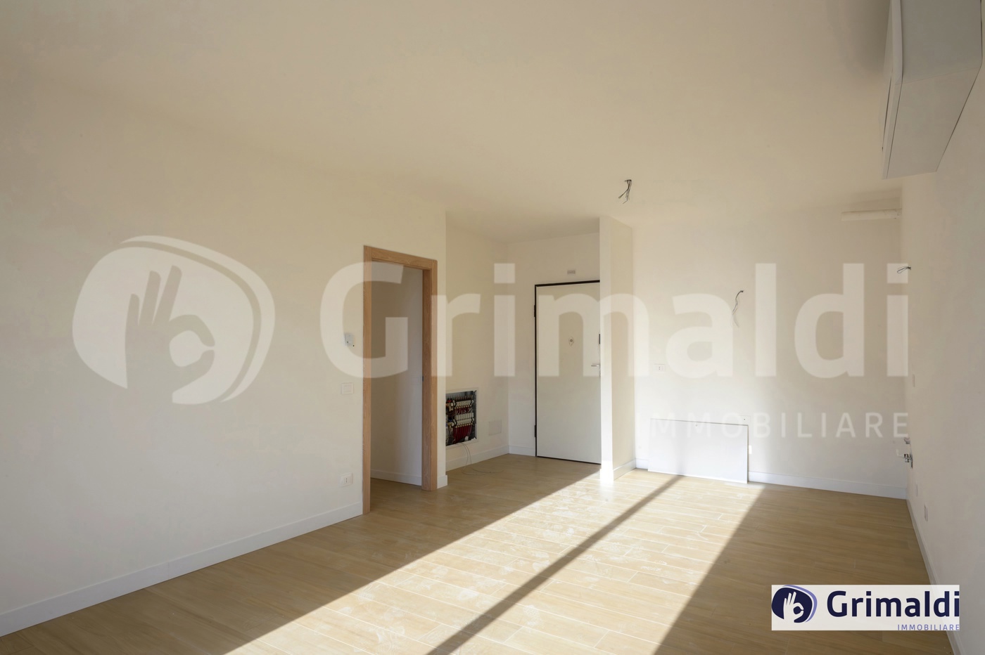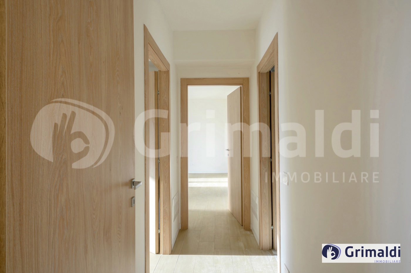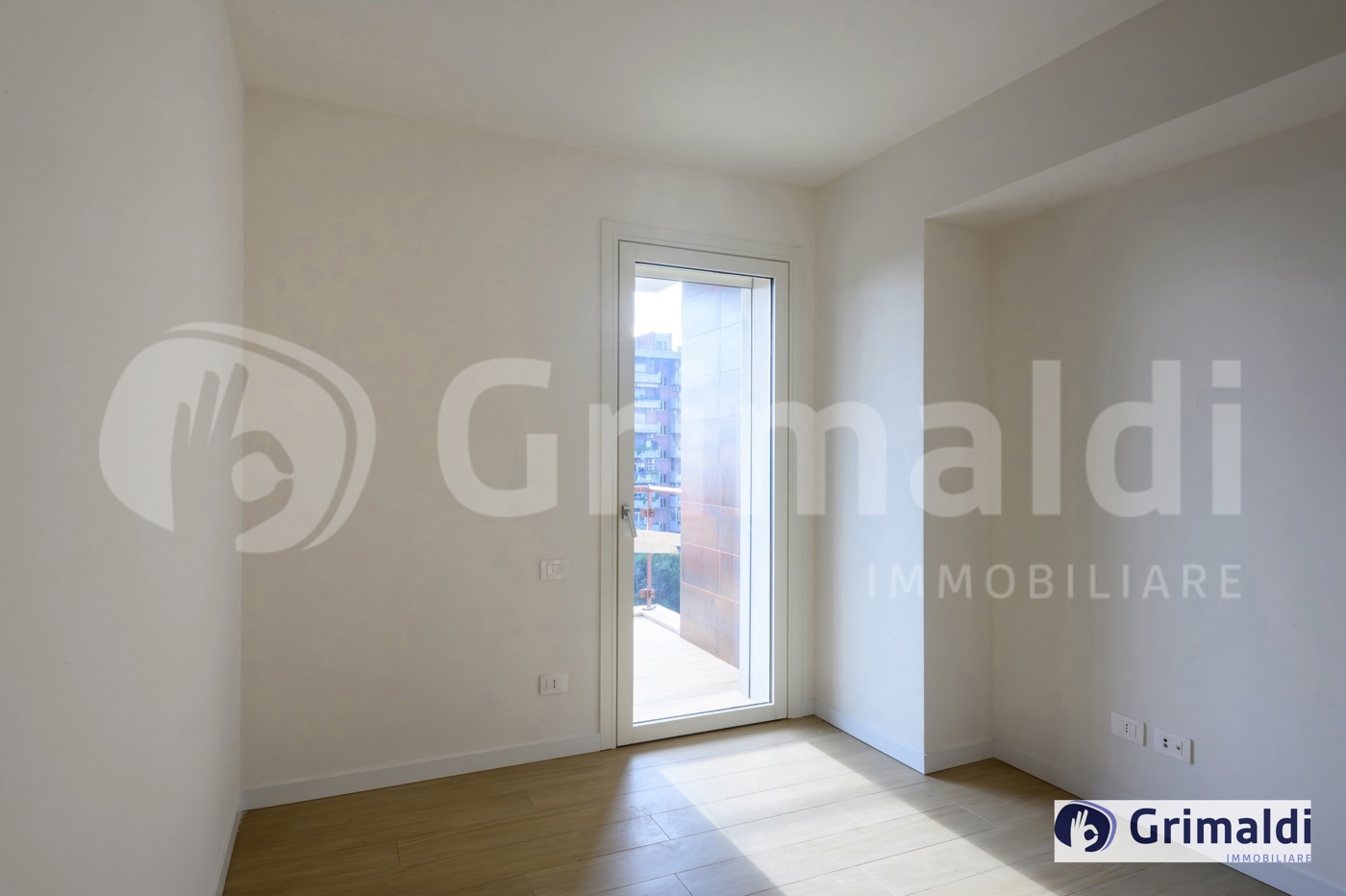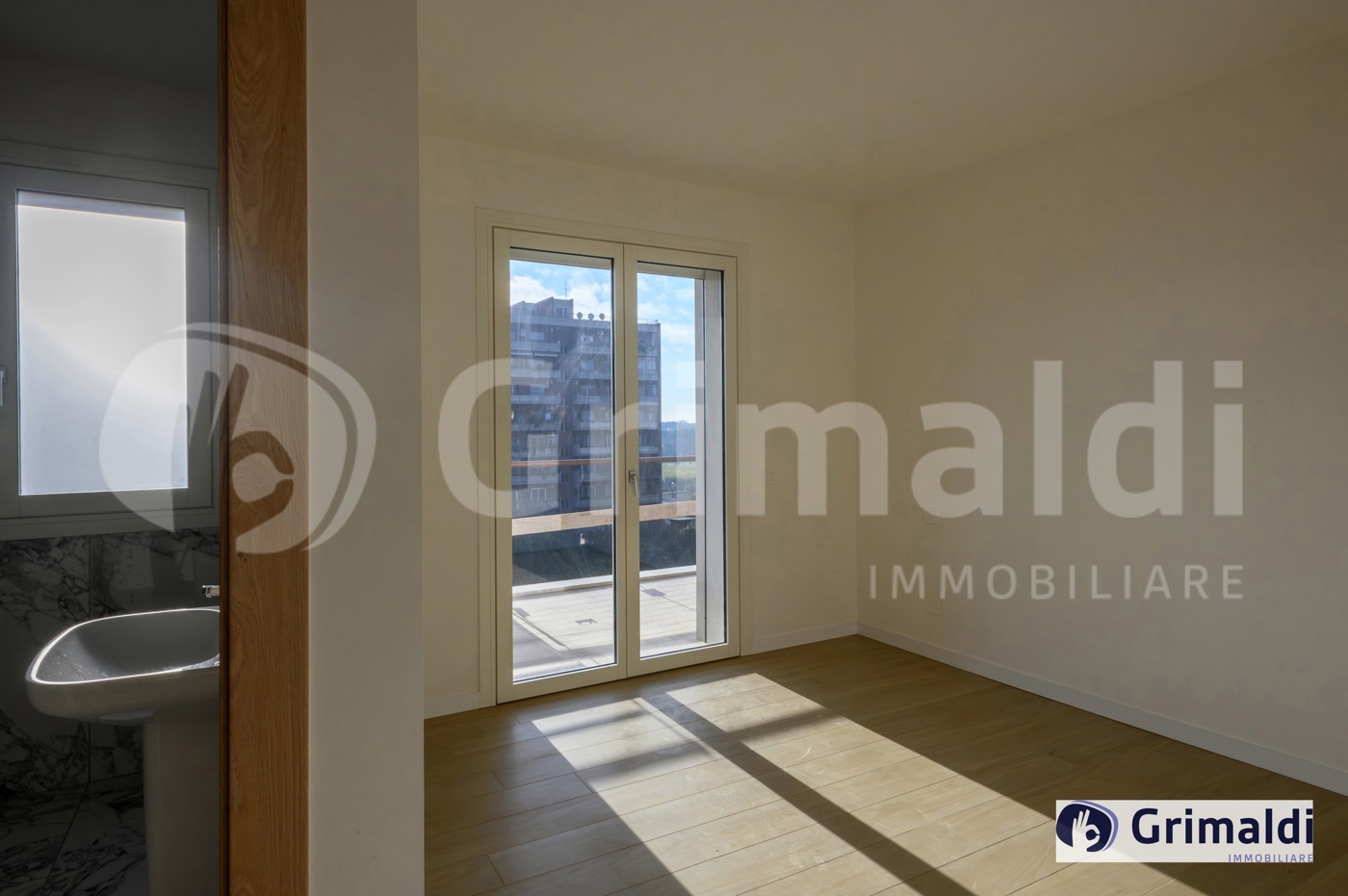 DISPONIAMO DI DIVERSE TIPOLOGIE DI TRILOCALI con TERRAZZO, a partire da Euro 383.000,00, tutti corredati da finiture eleganti ed esclusive, con infissi in legno laccato "Dear", pavimenti e rivestimenti in gres porcellanato "Energie Ker", esterni arricchiti con cristalli e fioriere in cemento bianco, impianti firmati da grandi e storici marchi quali "BTicino" e "Ideal Standard". Il trilocale proposto composto da soggiorno con cucina a vista, disimpegno, due camere da letto, doppi servizi di cui uno en suite.
