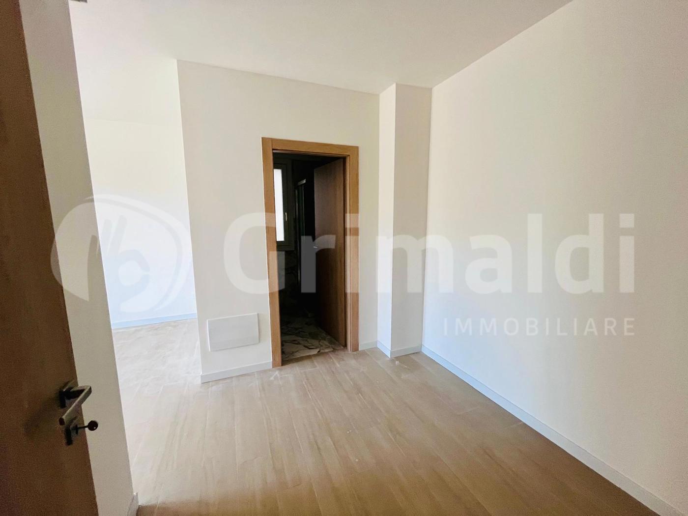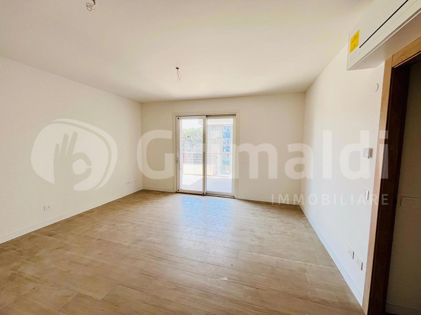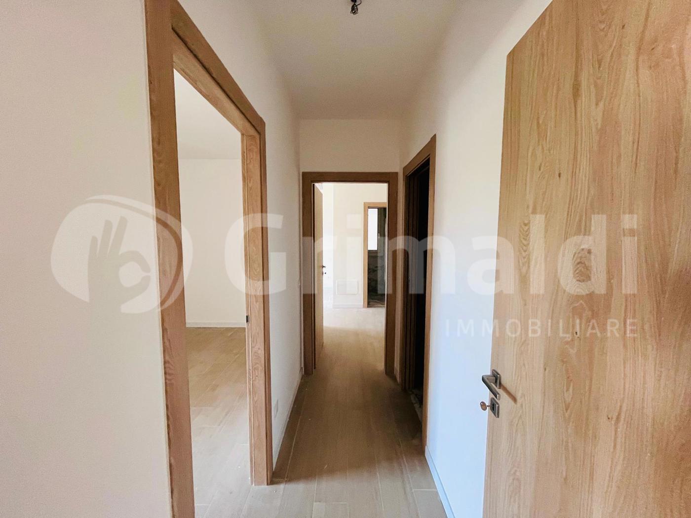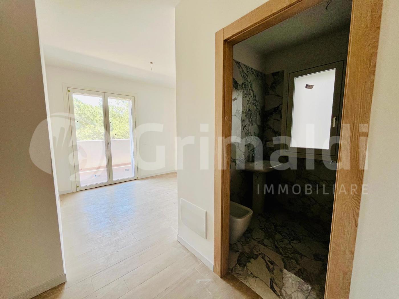 DISPONIAMO DI DIVERSE TIPOLOGIE DI TRILOCALI con TERRAZZO, a partire da Euro 401.000,00, tutti corredati da finiture eleganti ed esclusive, con infissi in legno laccato "Dear", pavimenti e rivestimenti in gres porcellanato "Energie Ker", esterni arricchiti con cristalli e fioriere in cemento bianco, impianti firmati da grandi e storici marchi quali "BTicino" e "Ideal Standard". Il trilocale proposto composto da soggiorno con cucina a vista, disimpegno, due camere da letto, doppi servizi di cui uno en suite.