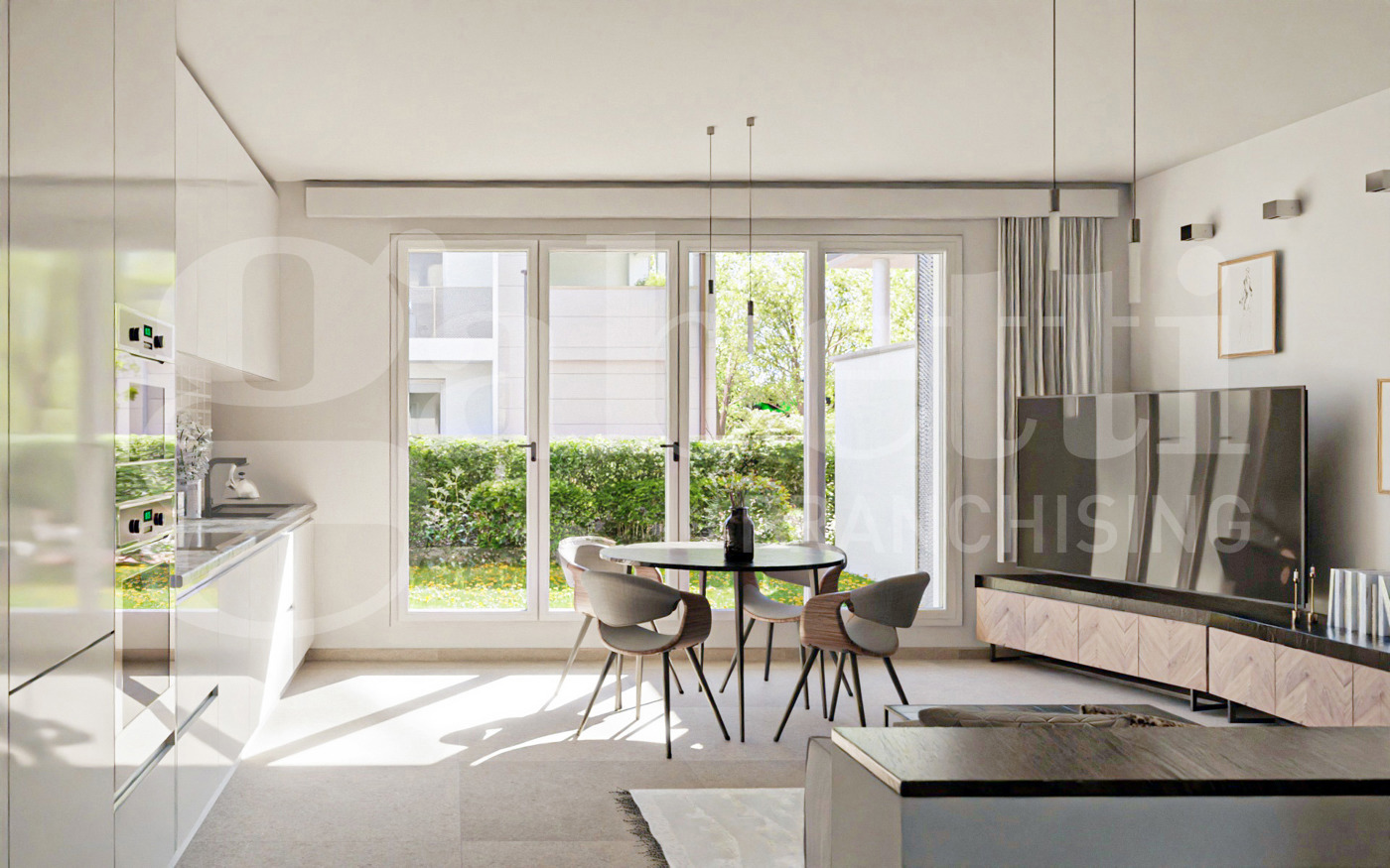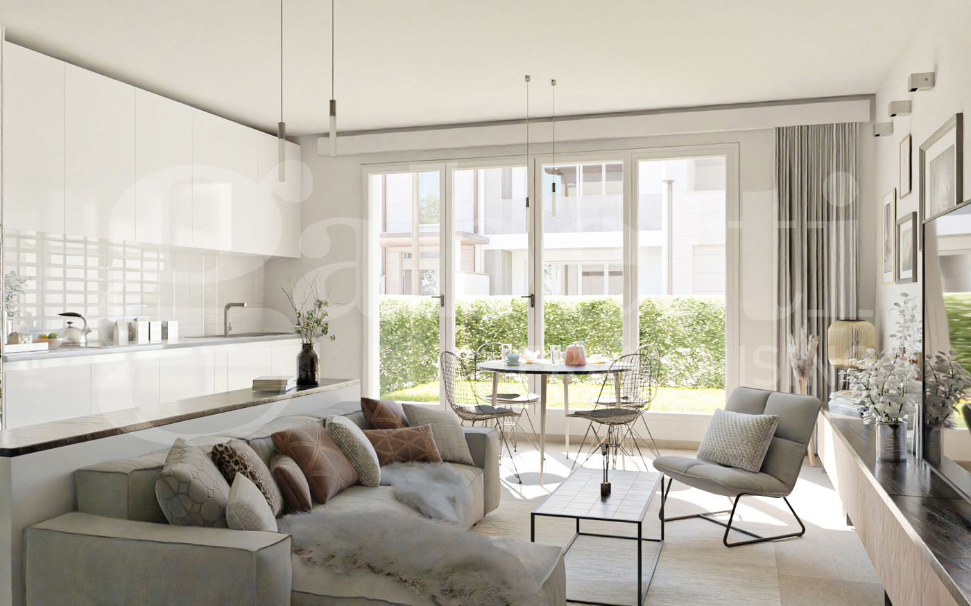 Consegna prevista Settembre 2026. Appartamento al piano terra composto da ingresso su sala con cucina a vista e accesso al giardino, disimpegno, due camere matrimoniali, due bagni e ulteriore giardino sul retro.