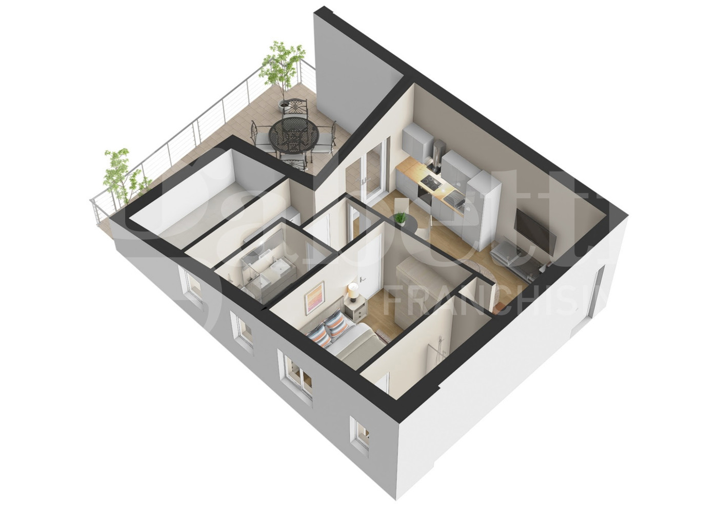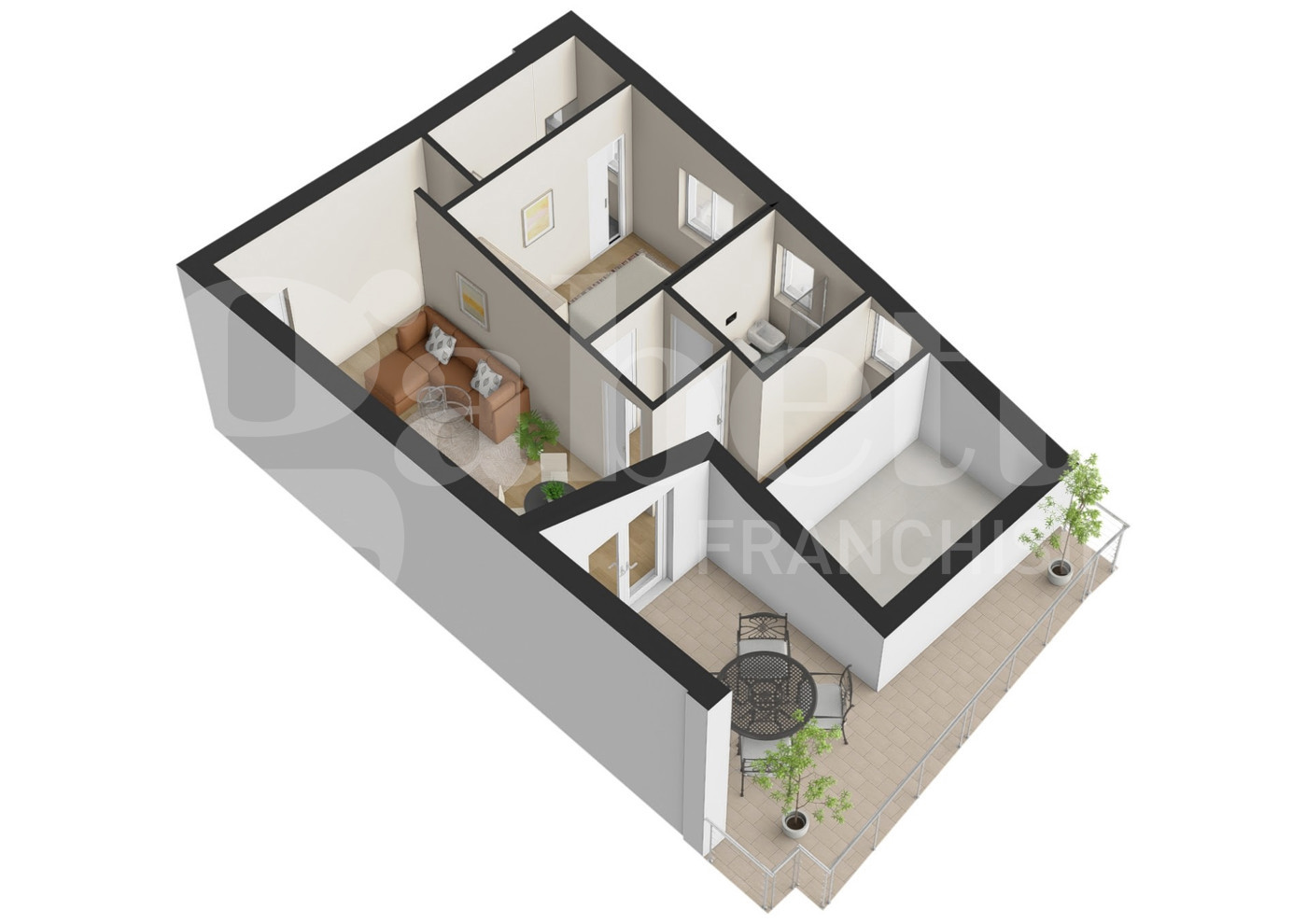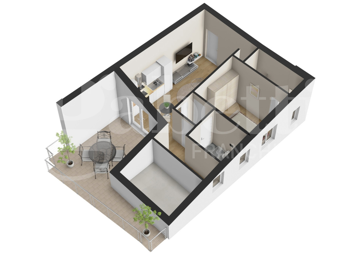 In particolare proponiamo l'appartamento, al 4° piano, si compone di un accogliente soggiorno con angolo cottura, una camera matrimoniale, una cameretta, due bagni e un ampio terrazzo.